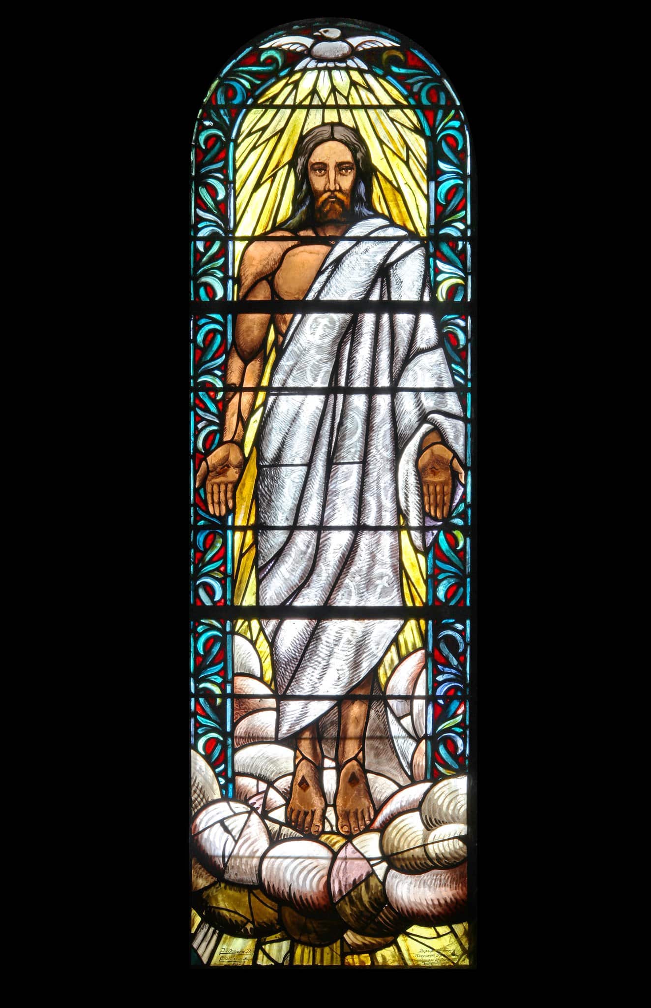 Le Christ est debout sur un nuage et présente les stigmates sur ses mains et ses pieds. Au-dessus la colombe de l’Esprit saint.