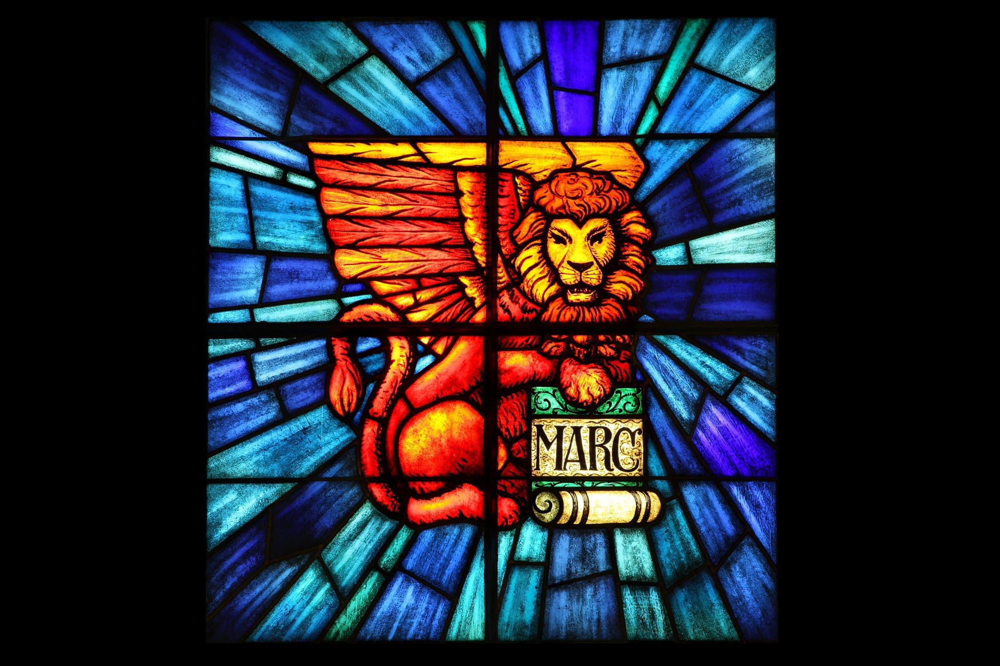 Un lion ailé assis, tient de sa patte droite un rouleau avec le nom de l'Evangile de Marc. Le tout sur un fond bleu.
