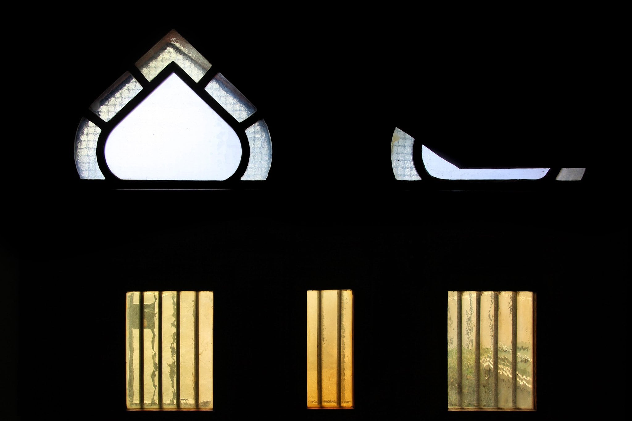 La partie supérieure d’une porte à deux battants est ajourée et décorée de verre jaune. Au-dessus, deux ouvertures en arc outrepassé brisé sont décorées d’un vitrail avec du verre blanc et une bordure jaune.