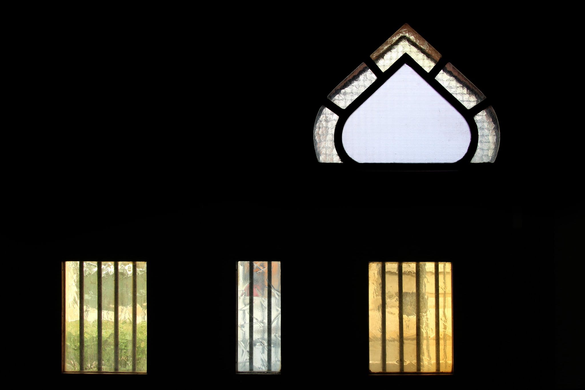 La partie supérieure d’une porte à deux battants est ajourée et décorée de verre jaune. Au-dessus, une ouverture en arc outrepassé brisé sont décorées d’un vitrail avec du verre blanc et une bordure jaune.