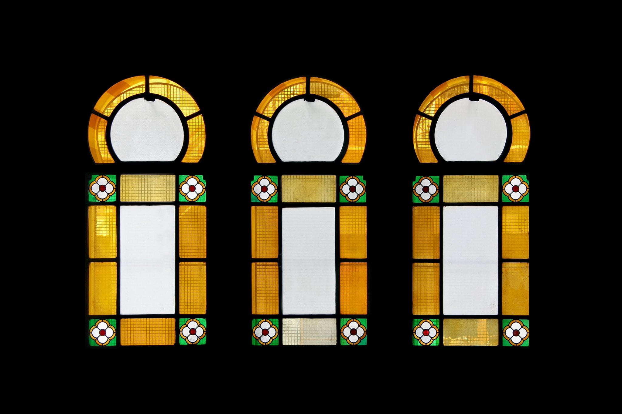 Trois vitraux ornementaux avec une bordure jaune décorée de fleurons dans les quatre angles.
