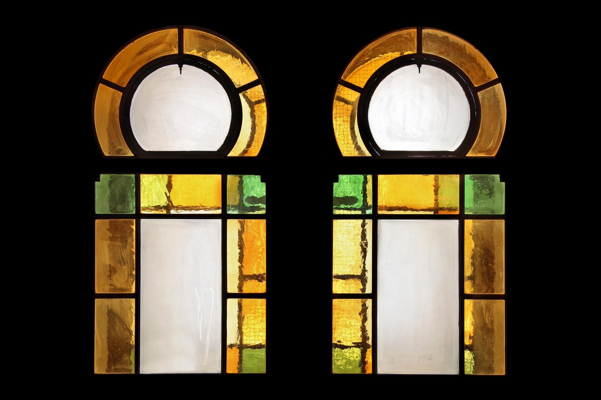 Deux vitraux ornementaux avec une bordure jaune et du vert aux quatre angles.
