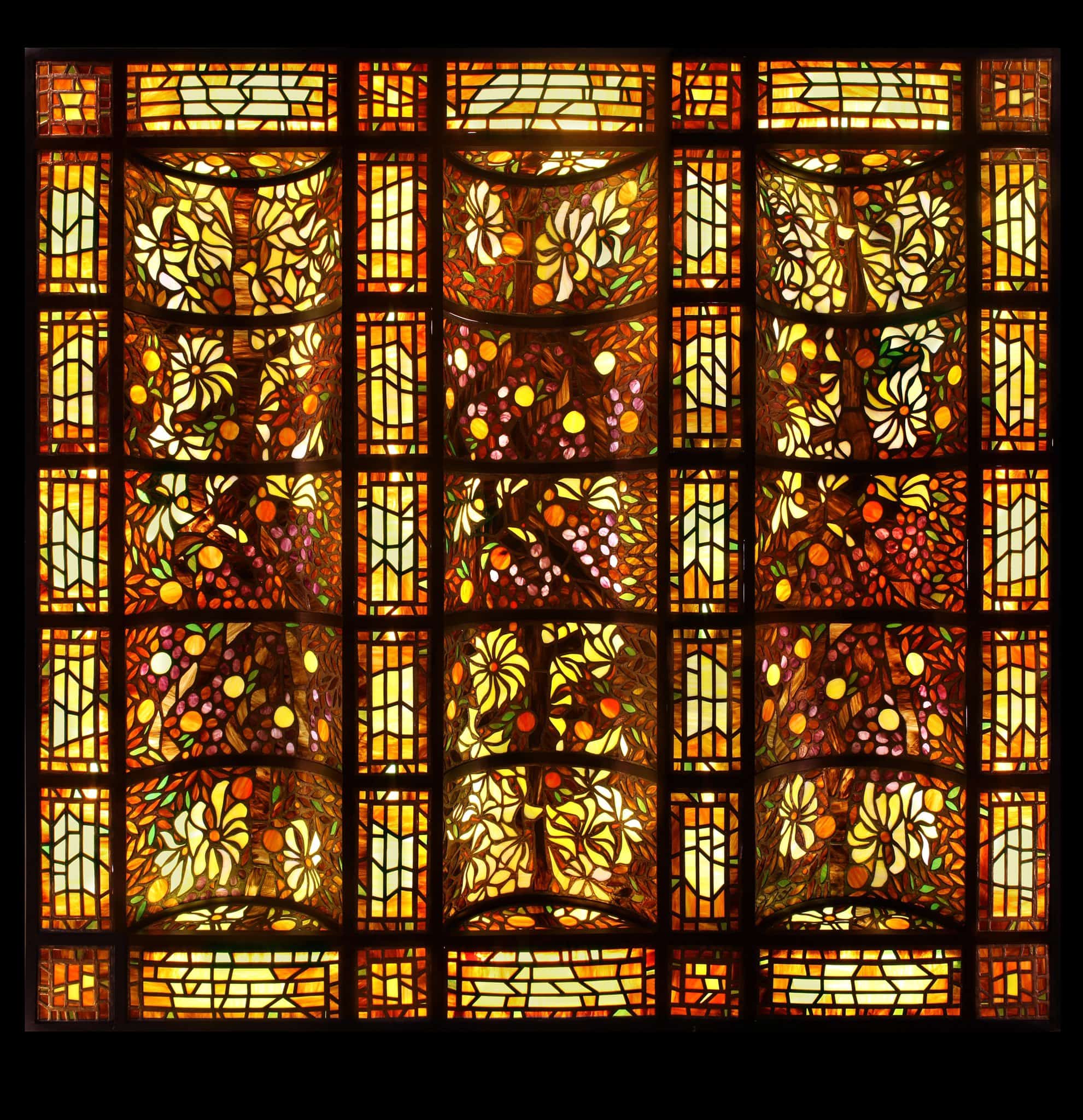 Un plafond en vitrail Tiffany, subdivisé en trois parties voûtées et entouré d’une large bordure, présente une végétation luxuriante composée de fleurs et de fruits. Il est éclairé par une lumière naturelle.