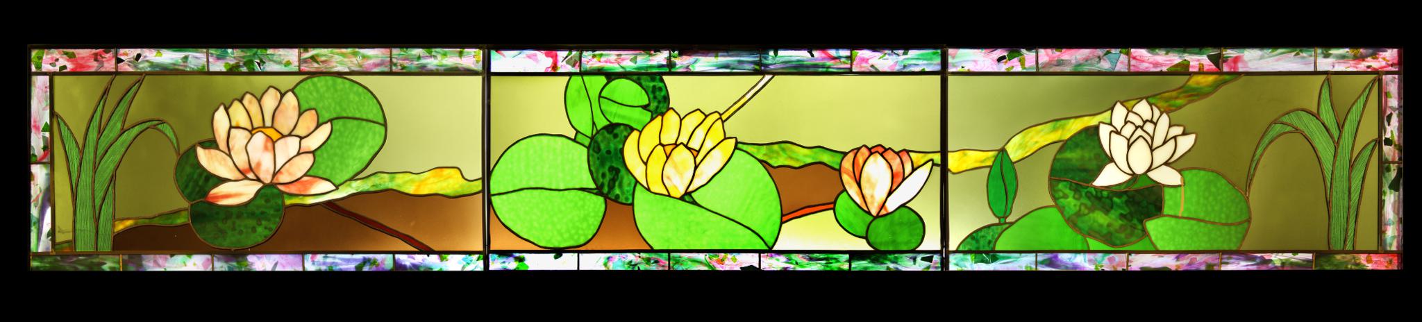 Quatre nénuphars en vitrail Tiffany se déploient entre deux gerbes herbacées. Le tout est encadré d’une fine bordure abstraite dans les teintes vertes, rouges, bleues et blanches.
