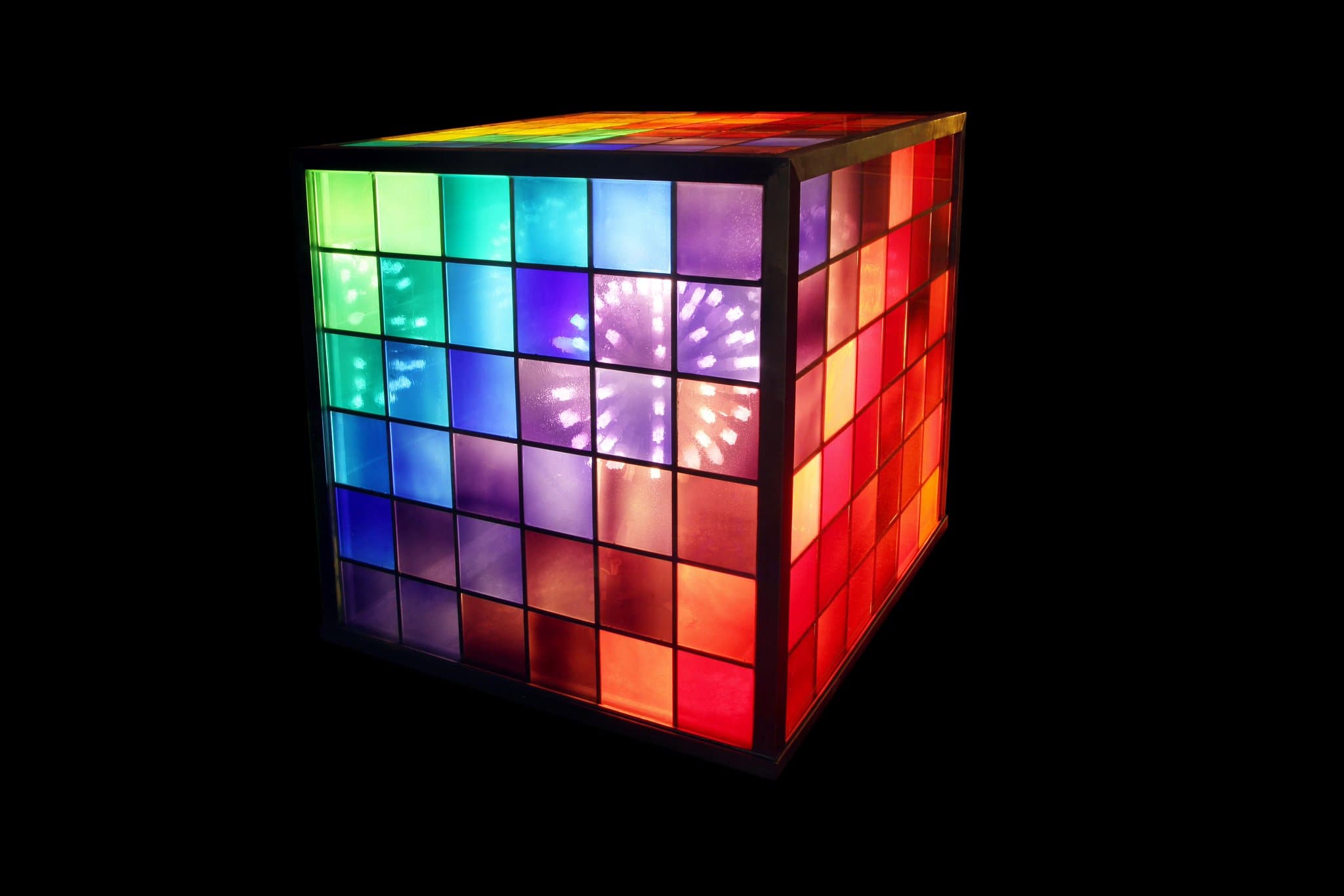 Un grand cube composé sur chacune des cinq faces de 36 carrés de verres orange, jaune, verre et bleu sertis d’acier inox contient à l’intérieur un luminaire électrique. Il fait partie d’une oeuvre globale comprenant quatre éléments dont trois sont en granit noir (un cube, une sphère inscrite dans un cube et une sphère), situés de l’autre côté de la route.