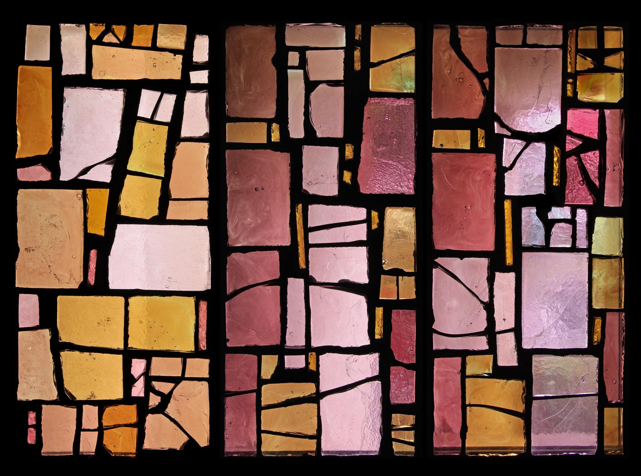 Dalle de verre abstraite composée de trois baies aux teintes beige, jaune, mauve, rose et blanche.