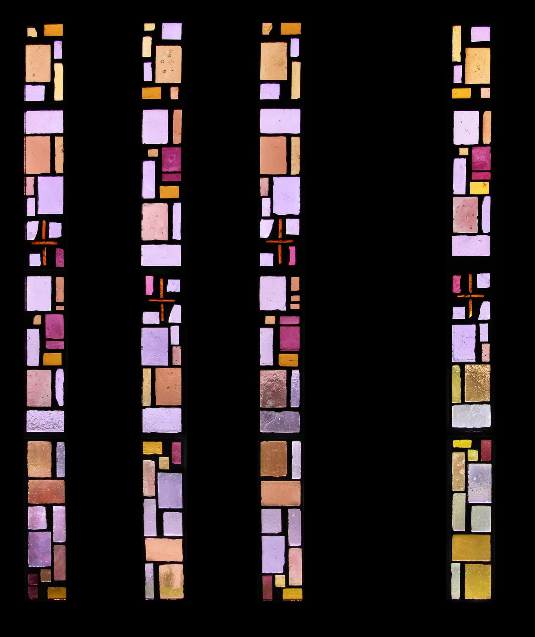 Dalle de verre abstraite composée de quatre baies étroites aux teintes beige, jaune, mauve, rose et blanche. Une petite croix brune symbolisant une station du chemin de croix figure à des hauteurs différentes au milieu des quatre ouvertures.