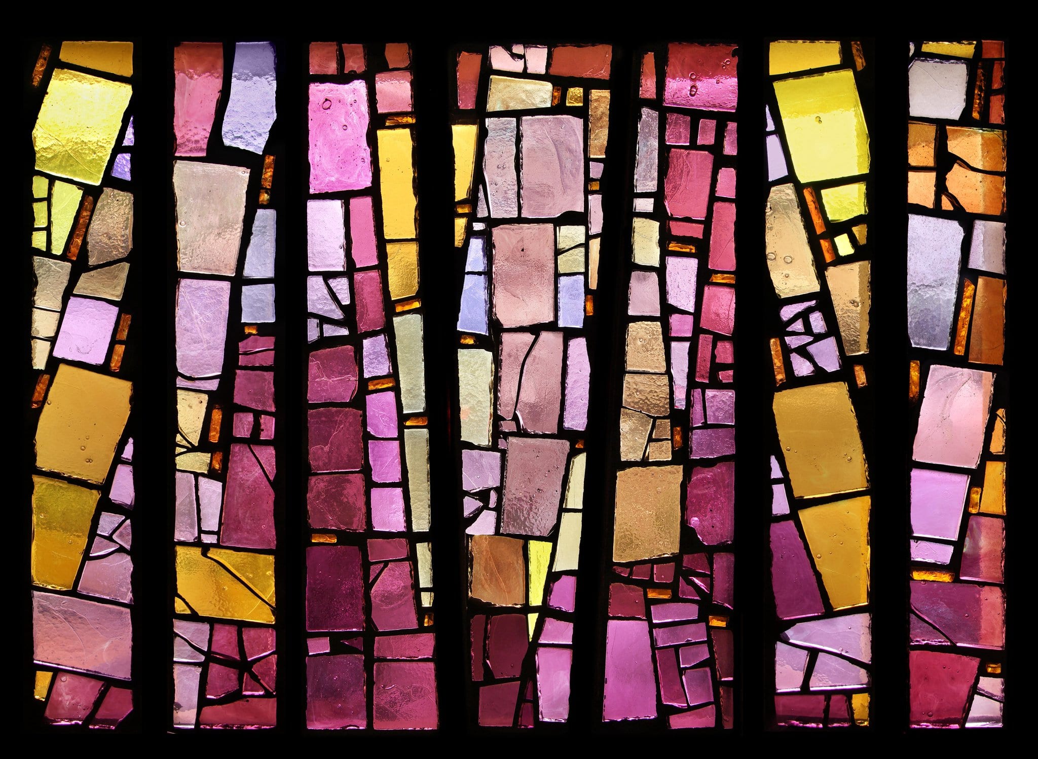 Dalle de verre abstraite composée de sept baies étroites et d’une ouverture plus grande au centre, toutes dans les teintes beige, jaune, mauve, rose et blanche.