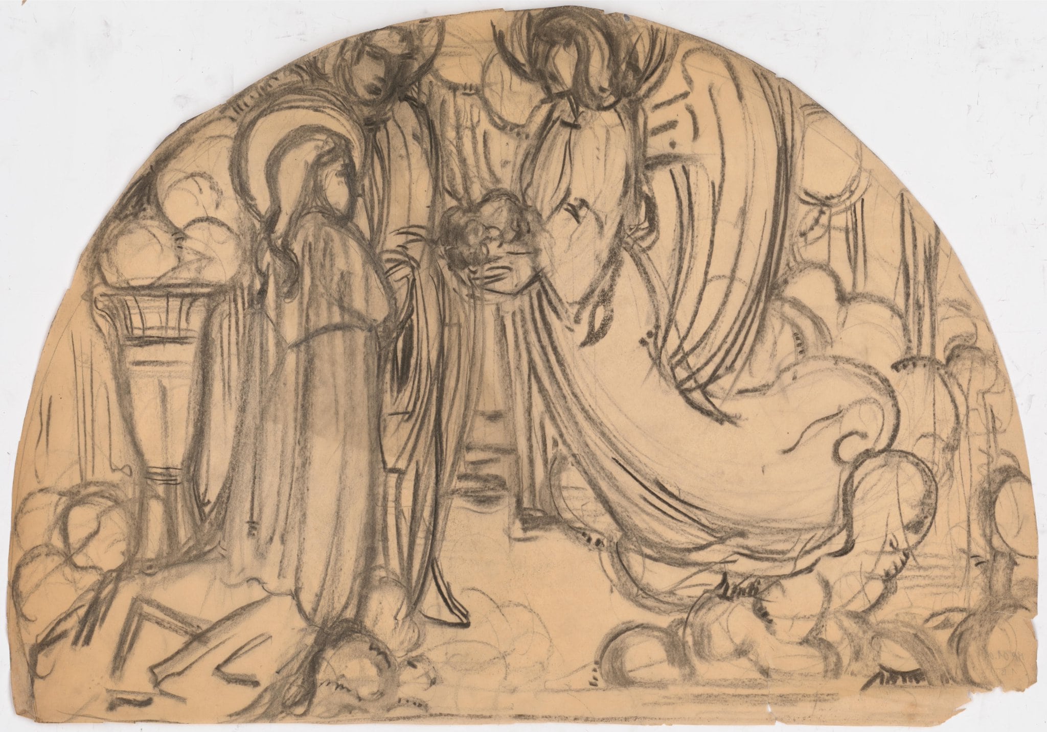 Plus de 70 projets peuvent être rattachés aux vitraux de Saint-Paul, et 51 aux trois vitraux des bas-côtés, mais l’ensemble n’est probablement pas complet. Pour le vitrail de sainte Cécile, il existe 17 oeuvres graphiques dont trois peuvent être reliées à la scène supérieure du vitrail (MP_01.01 ; MP_01.02 ; MP_01.03). Elles illustrent particulièrement bien les différentes étapes qui jalonnent le processus de création. Sur cette esquisse, l'artiste place les grandes lignes de sa composition et l'emplacement et la posture de ses personnages, montrant un état déjà abouti par rapport au vitrail. Une fois ces éléments principaux fixés, il s’intéresse à l’équilibre des contrastes et aux jeux d'ombre et de lumière à travers un dessin travaillé au crayon de manière très minutieuse (MP_01.02), présentant des hachures qui évoquent le futur travail de la grisaille, dans une démarche qui est autant celle du peintre que du verrier. Enfin, il cherche à définir le tracé des plombs en travaillant uniquement les contours (MP_01.03).