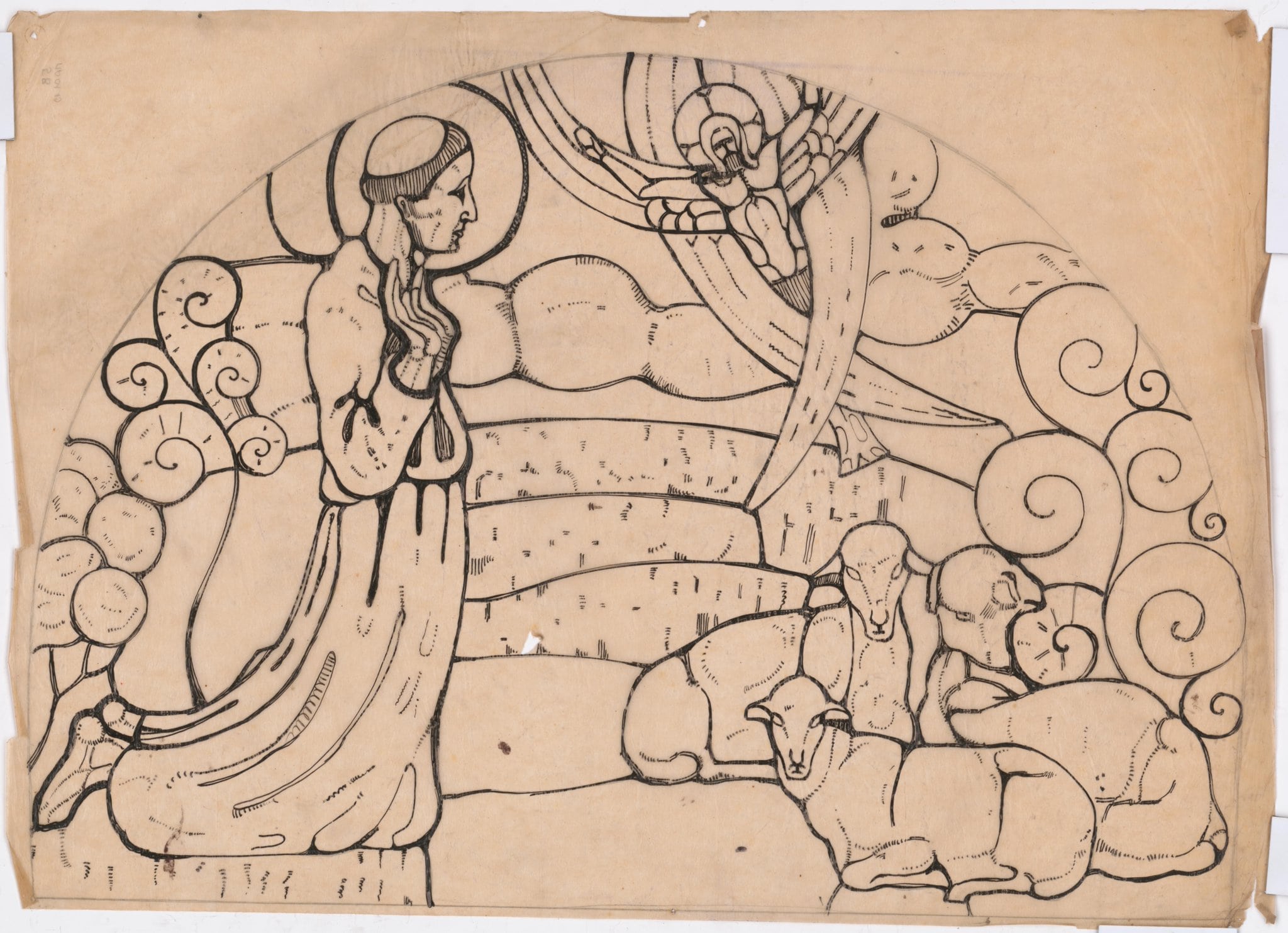 Ce travail préparatoire a été réalisé par Marcel Poncet en 1915 pour le vitrail dédié à saint François d'Assise (GE_08.11), situé dans le bas-côté sud-est de l'église Saint-Paul de Cologny (GE), dans le quartier de Grange-Canal. Il correspond à la partie supérieure du vitrail, représentant saint François au Mont Alverne, recevant l'apparition d'un séraphin révélant entre ses ailes le Christ crucifié qui le touche profondément et imprime sur ses mains et ses pieds des stigmates similaires à ceux du Christ (Berthaumier, 1855, pp. 135-138).