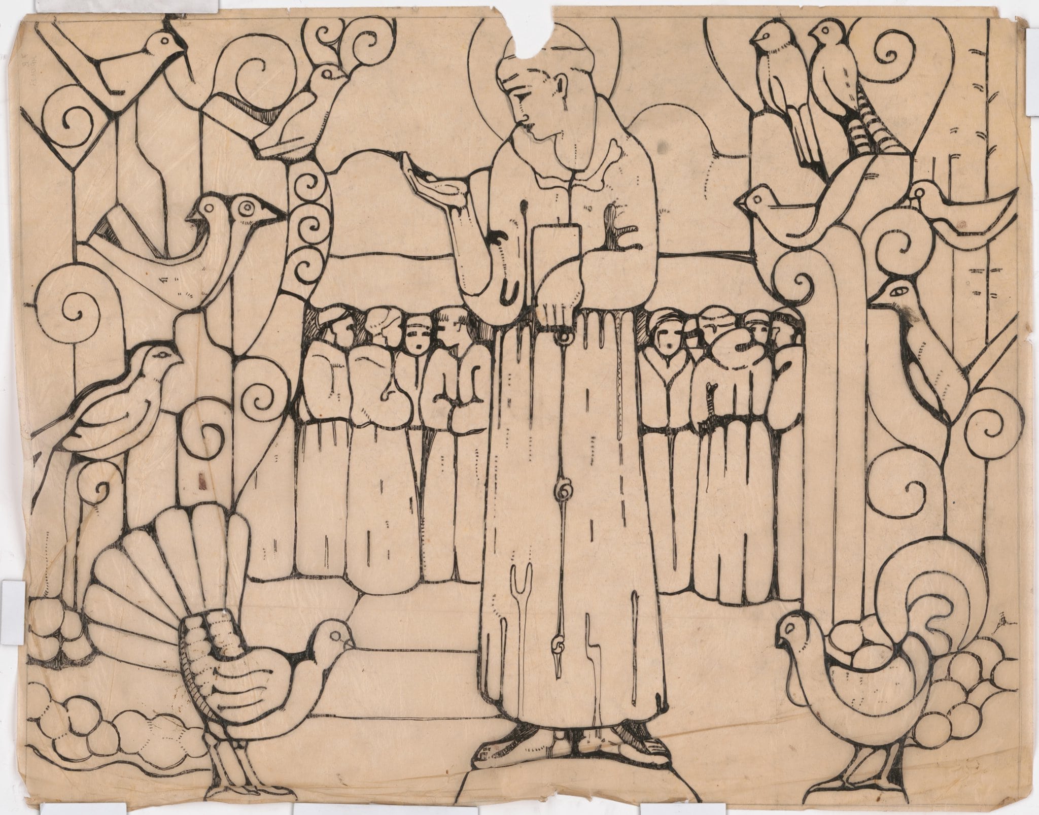 Ce travail préparatoire a été réalisé par Marcel Poncet en 1915 pour le vitrail dédié à saint François d'Assise (GE_08.11), situé dans le bas-côté sud-est de l'église Saint-Paul de Cologny (GE), dans le quartier de Grange-Canal. Il correspond à la partie médiane du vitrail, représentant saint François d'Assise prêchant aux oiseaux.