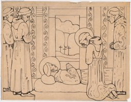 Ce travail préparatoire a été réalisé par Marcel Poncet en 1915 pour le vitrail dédié à saint François d'Assise (GE_08.11), situé dans le bas-côté sud-est de l'église Saint-Paul de Cologny (GE), dans le quartier de Grange-Canal. Il correspond probablement à la partie médiane du vitrail, représentant saint François d'Assise prêchant aux oiseaux.