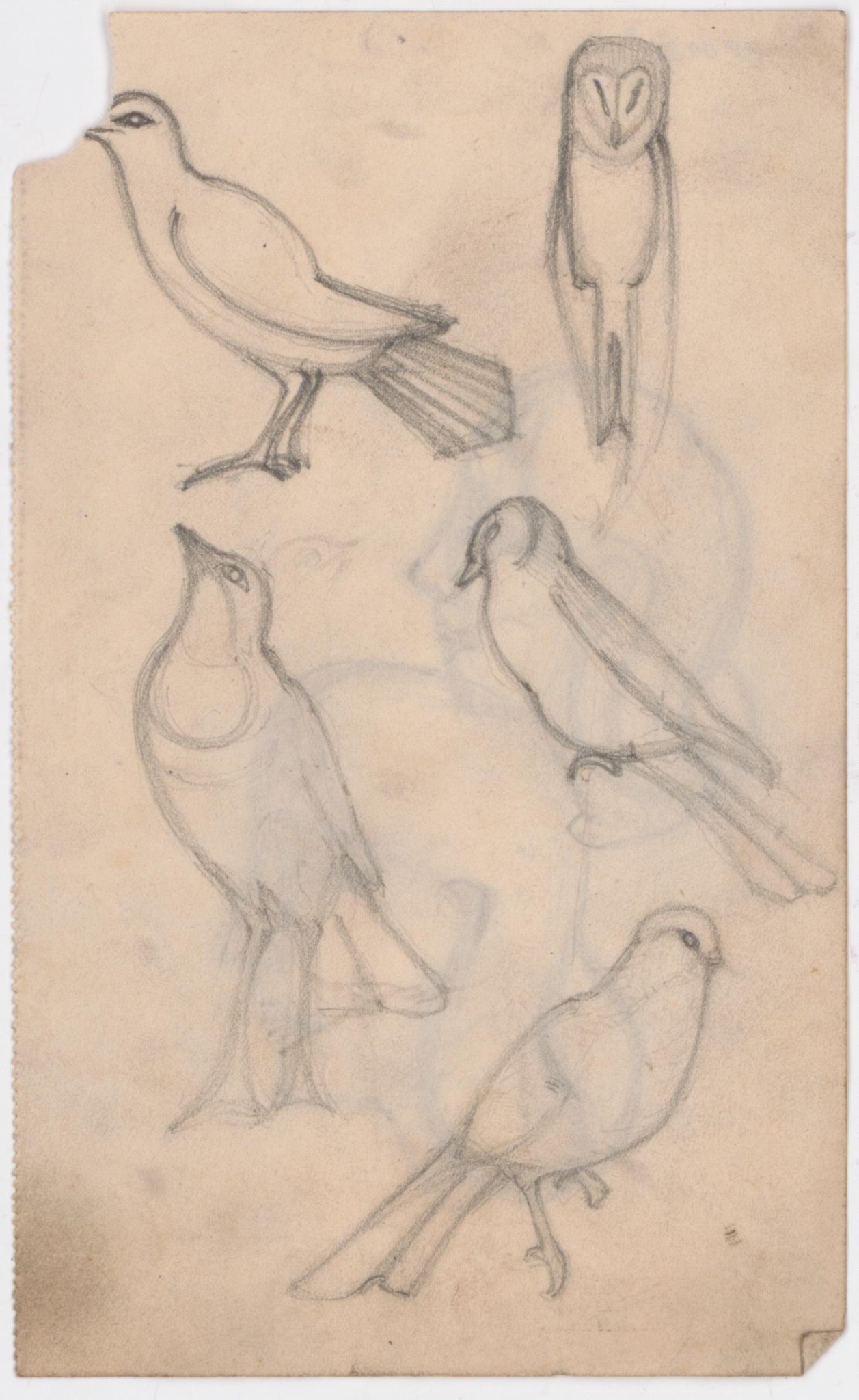 Plus de 70 projets peuvent être rattachés aux vitraux de Saint-Paul, et 51 aux trois vitraux des bas-côtés, mais l’ensemble n’est probablement pas complet. Pour le vitrail de saint François, il existe 12 oeuvres graphiques, dont sept peuvent être reliées à la scène médiane du vitrail (MP_01.20 ; MP_01.22 ; MP_01.21 ; MP_01.25 ; MP_01.26 ; MP_01.27 ; MP_01.75). Cette esquisse correspond probablement à l'un des premiers stades dans le processus de création. L'artiste étudie, probablement d'après des modèles issus de livres d'ornithologie, différentes espèces d'oiseaux qu'il prévoit de placer tout autour de saint François en train de prêcher à leur attention. Cette démarche est typique du souci de bien faire d'un jeune artiste tout juste sorti des Beaux-Arts. S'il envisage de représenter tout d'abord les volatiles de manière assez réaliste, comme on le voit sur un projet au crayon (MP_01.25), il optera ensuite pour un dessin de plus en plus stylisé qu'il adopte autant pour les oiseaux que pour la végétation dans laquelle ils évoluent (MP_01.26 ; MP_01.27).