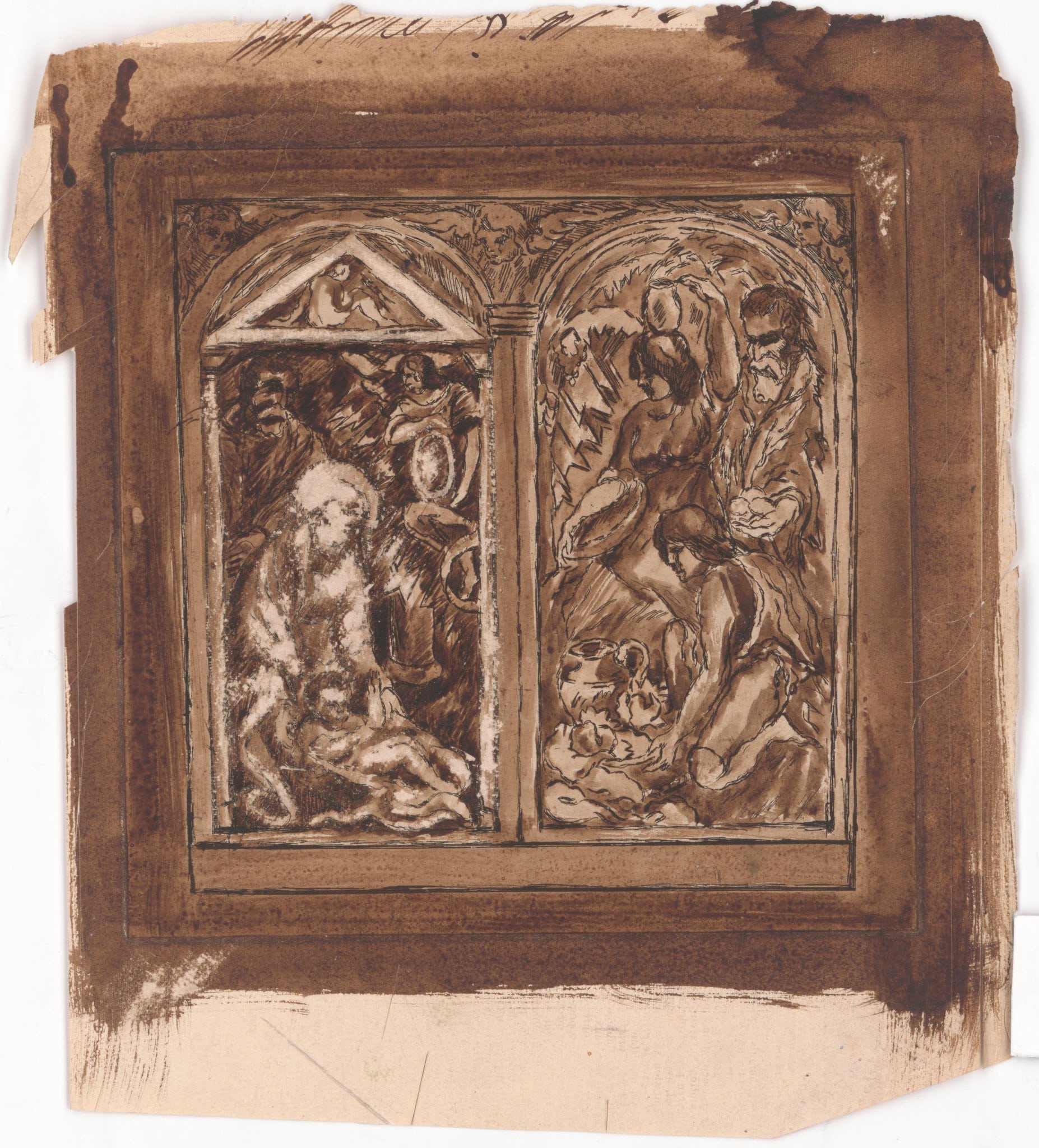 Composition en deux parties, comprises sous des arcades en plein cintre ornées d'angelots dans les écoinçons. Dans la partie de gauche, la Vierge est agenouillée auprès de l'enfant Jésus bénissant, couché dans la crèche. Joseph se tient à sa gauche, et un ange apparaît à droite, portant un médaillon. Ils sont situés sous un fronton décoré d'une figure féminine assise. Dans la partie de droite, des personnages apportent divers présents à l'enfant et l'adorent.