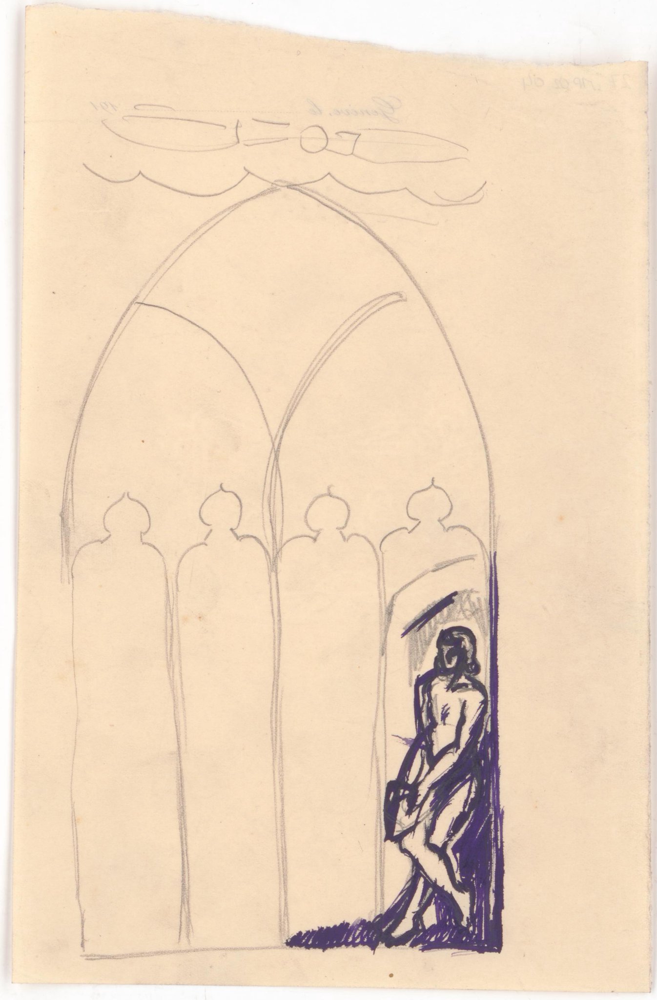Esquisse du vitrail des quatre Évangélistes avec saint Luc ou saint Jean debout à droite, avec esquissé autour de lui au crayon les lancettes et la forme du vitrail.