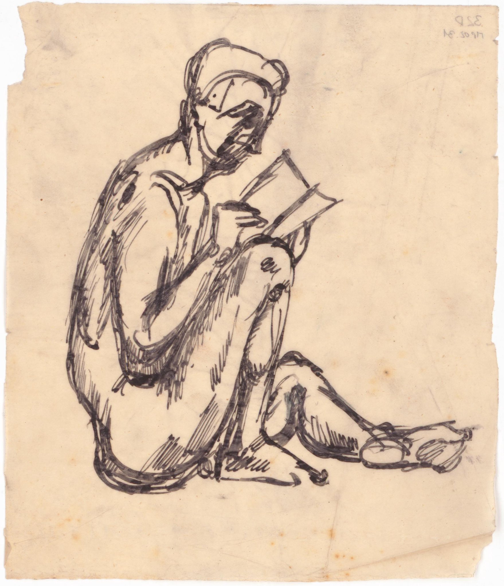 Saint Marc assis de profil, lisant un livre posé sur son genou droite replié, nu.