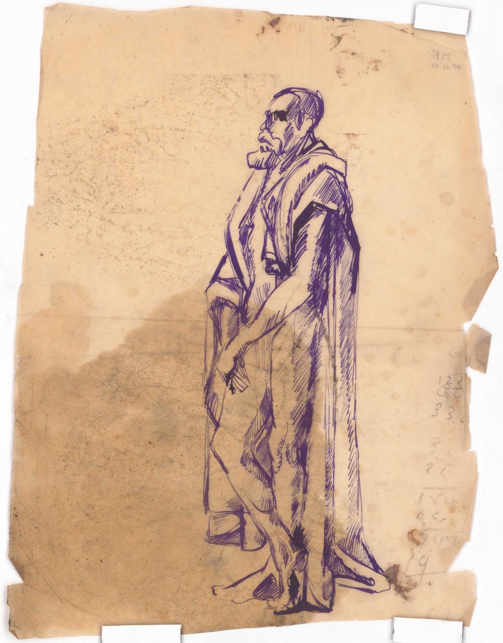 Ce projet fait probablement partie des premiers travaux de Poncet pour le vitrail des quatre Evangélistes, où il étudie la posture du personnage debout tout à droite, saint Luc sur le vitrail (plusieurs travaux préparatoires indiquent que Poncet avait d'abord imaginé mettre saint Jean à cette place). Des photographies retrouvées dans les archives Poncet à Vich indiquent que l'artiste a eu recours à un modèle prenant cette pose pour définir l'anatomie de son personnage.
