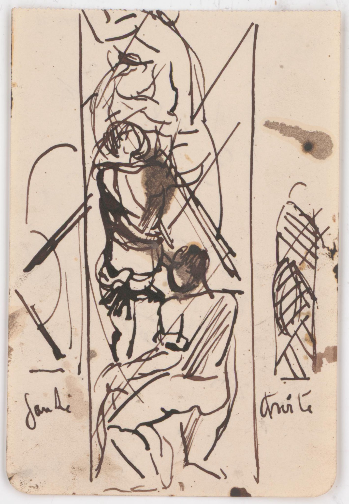 Esquisse visant à définir, dans les grandes lignes, la composition du futur vitrail, notamment la lancette de droite. Il pourrait s'agir de personnages, dont probablement le porte-éponge, montant sur une échelle ou soutenu par les autres pour atteindre le Christ. Toutefois, cette composition sera modifiée par après au profit d'une foule plus dense de personnages sur les lancettes.