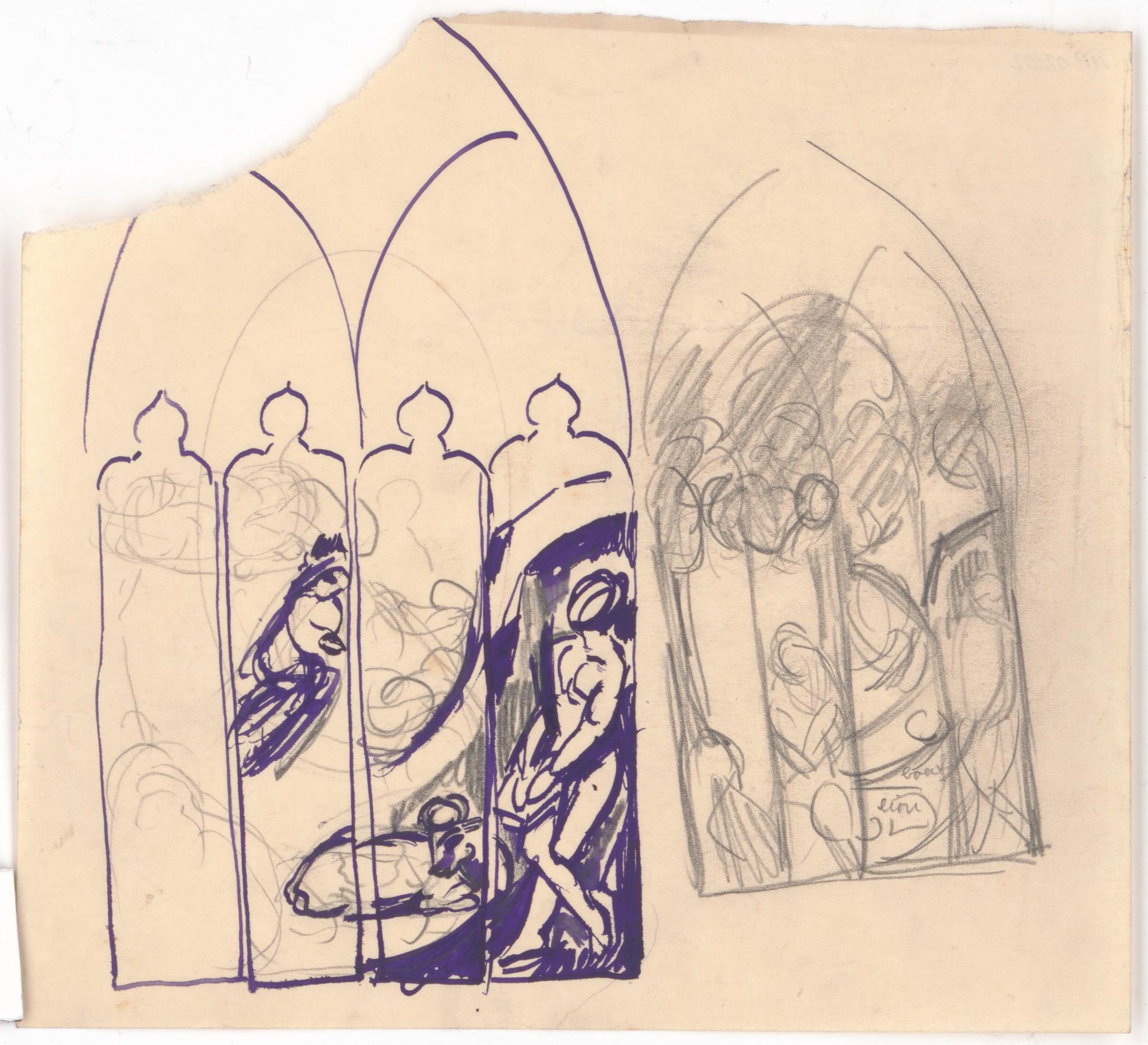 Deux esquisses du vitrail des quatre Évangélistes en entier, avec étude du positionnement des personnages dans les quatre lancettes.