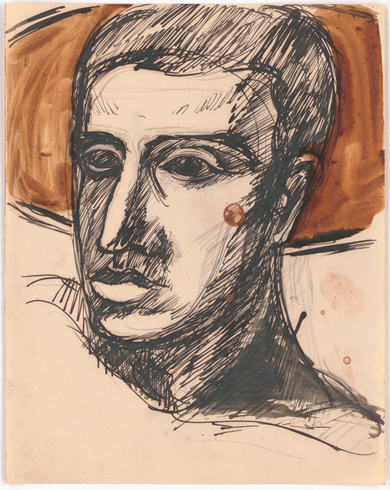 Tête de saint Jean, auréolé et tourné de trois-quarts, les cheveux courts, imberbe.