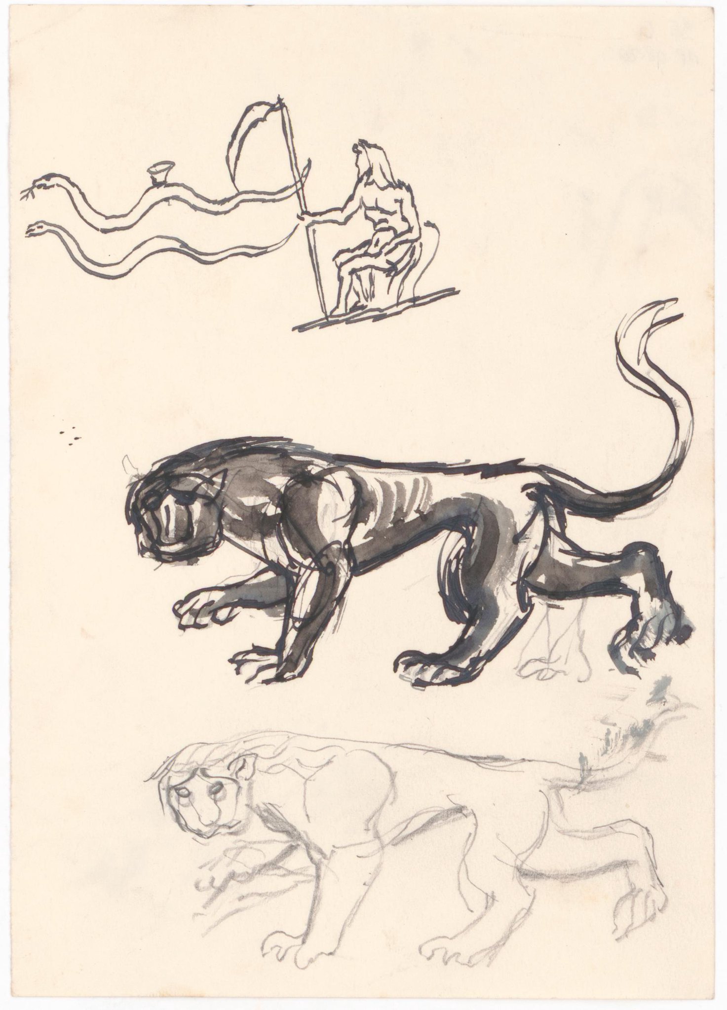 Esquisses pour des vitraux sur le thème de la "carte du ciel": le Lion deux fois en bas représenté de profil et la tête basse, et la constellation du Serpentaire en haut, personnifiée par Asklépios, dieu de la médecine coupant la constellation du serpent, représentée par deux reptiles.