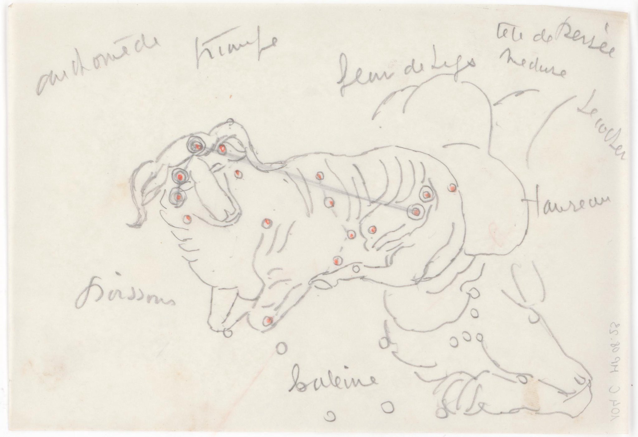 Étude pour des vitraux sur le thème de la "carte du ciel": le Bélier couché. La figure suit le tracé des étoiles et des lignes de sa constellation (dessinées au crayon au verso).