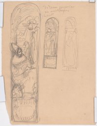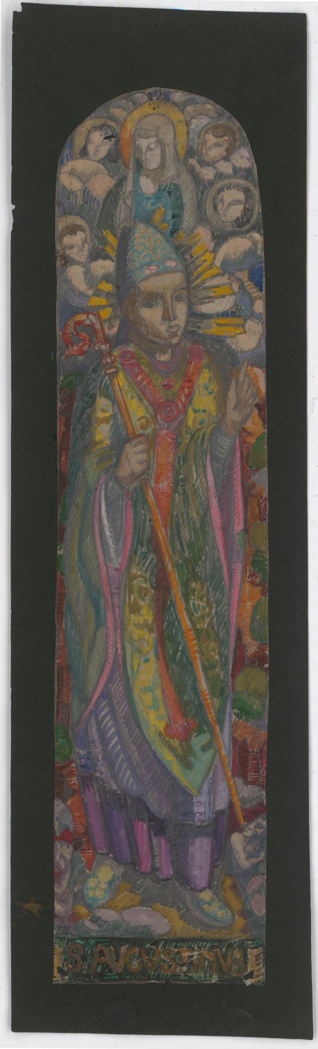 Poncet réalise deux maquettes pour le vitrail de saint Augustin (MP_03.04 et MP_03.07) qui traduisent deux conceptions très différentes. Dans la première, MP_03.04 le saint occupe moins de place et l'aspect décoratif est très présent. La composition est également plus narrative et didactique, avec le Christ en croix dans le fond et les trois anges dans les nuages. Poncet semble ensuite se tourner vers une composition moins narrative, où l'expressivité et le caractère du saint sont renforcés, tandis que le seul élément didactique, la mère du saint apparaissant entourée d'anges, est relégué au sommet du vitrail. C'est cette formule qui sera conservée dans les cartons définitifs (MP_03.11 et MP_03.16).