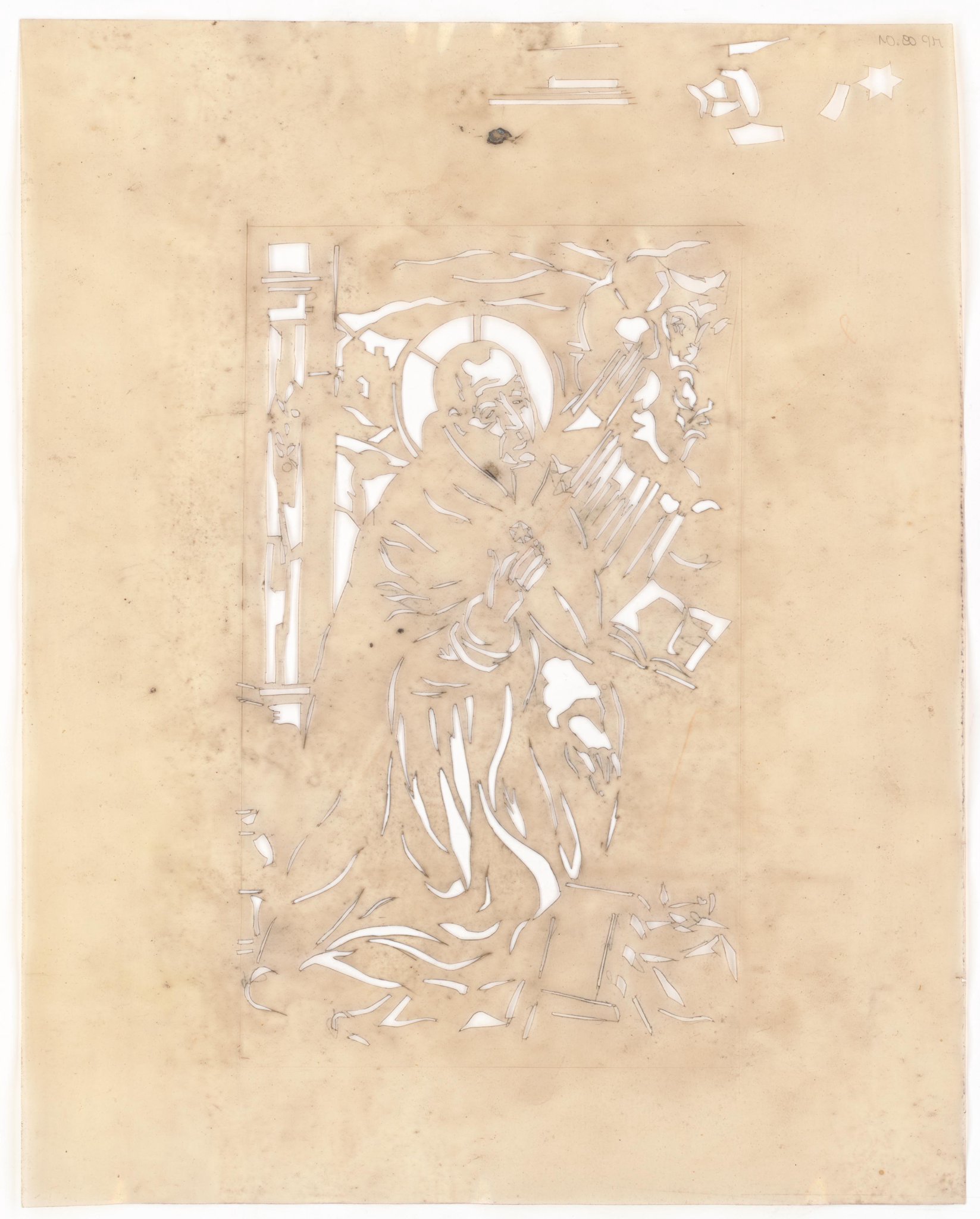 Ce travail préparatoire a été réalisé dans le cadre d'une commande de vitraux pour la chapelle du Collège de l'Abbaye de Saint-Maurice en Valais. Cette chapelle est remaniée par l'architecte Adolphe Guyonnet au cours de l'année 1926. La commande des vitraux est adressée à Marcel Poncet, par l'intermédiaire de son frère le Chanoine Louis Poncet. L'artiste réalise de petits vitraux en simples carreaux de verres jaunes et or à l'antique, avec de petits panneaux comprenant cinq Docteurs de l'Église traités en noir comme des gravures, en alternance avec des médaillons décoratifs. Le reste de la décoration est réalisée par des membres du groupe de Saint-Luc (PONCET, 1926, pp. 147-149 ; LONFAT, 2006, p. 131 ; REYMOND, 1992, pp. 56, 168).