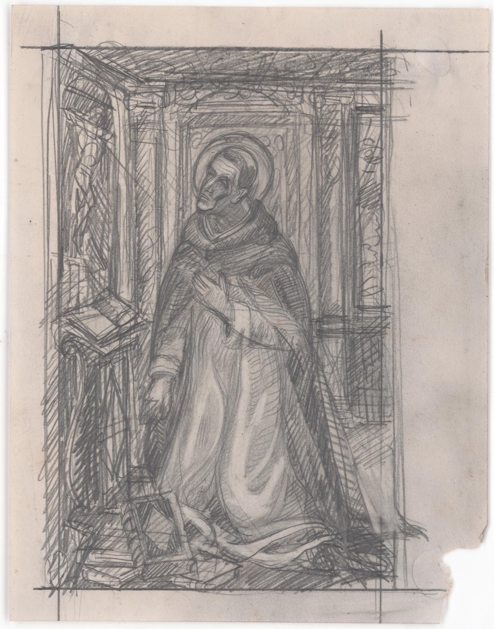 Ce travail préparatoire a été réalisé dans le cadre d'une commande de vitraux pour la chapelle du Collège de l'Abbaye de Saint-Maurice en Valais. Cette chapelle est remaniée par l'architecte Adolphe Guyonnet au cours de l'année 1926. La commande des vitraux est adressée à Marcel Poncet, par l'intermédiaire de son frère le Chanoine Louis Poncet. L'artiste réalise de petits vitraux en simples carreaux de verres jaunes et or à l'antique, avec de petits panneaux comprenant cinq Docteurs de l'Église traités en noir comme des gravures, en alternance avec des médaillons décoratifs. Le reste de la décoration est réalisée par des membres du groupe de Saint-Luc (PONCET, 1926, pp. 147-149 ; LONFAT, 2006, p. 131 ; REYMOND, 1992, pp. 56, 168).