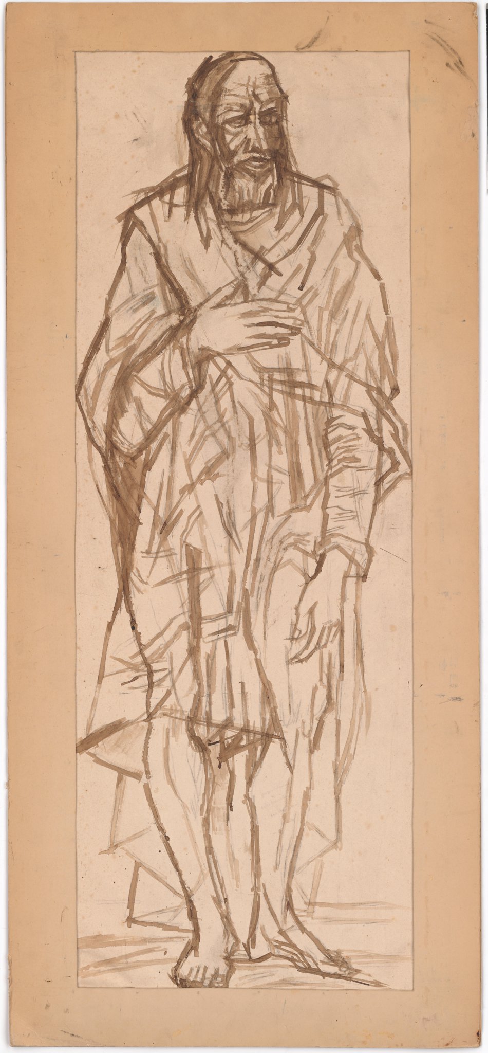 Ce travail préparatoire a été réalisé dans le cadre d'une commande de vitraux pour l'église Saint-Sigismond de Saint-Maurice en Valais. L'église ayant besoin d'être restaurée, le chanoine Louis Poncet propose à son frère de se charger de la réalisation de nouveaux vitraux, afin de remplacer les anciennes verrières du XIXème. La Paroisse disposant de peu de moyens, Marcel Poncet obtient un subside de la fondation Gleyre pour la réalisation de huit vitraux sur le thème des Prophètes. Les quatre premiers vitraux sont posés au cours de l'année 1944, et reçoivent des échos très positifs dans la presse. Les quatre derniers sont réalisés au cours de l'année 1946, et inaugurés en juin 1947. En 1960, les vitraux, alors jugés trop sombres pour la nef, ont été déplacés dans le choeur, superposés les uns au-dessus des autres. Ceux-ci n'ont retrouvé leur emplacement d'origine qu'en 2001, grâce à l'entremise de Jean-Pierre Coutaz, auteur des vitraux actuels du choeur. Ces oeuvres, qui jouent à la fois sur d'audacieux jeux de couleur et une grisaille abondante, semblent condenser les expériences antérieures de Marcel Poncet dans un nouvel équilibre entre ses métiers de peintre et de verrier. Les vitraux de Saint-Sigismond figurent, avec ceux de Saint-Paul de Grange-Canal et les quatre Evangélistes de la cathédrale de Lausanne, parmi ses réalisations les plus célèbres (NOVERRAZ, 2014, pp. 80-88 ; REYMOND, 1992, pp. 79, 108-112, 173-175 ; Dossier "Vitraux, Eglise Saint-Sigismond, Saint-Maurice, 1941-1947", boîte "VITRAUX II, 1932-1947", fonds Poncet, Vitrocentre Romont).