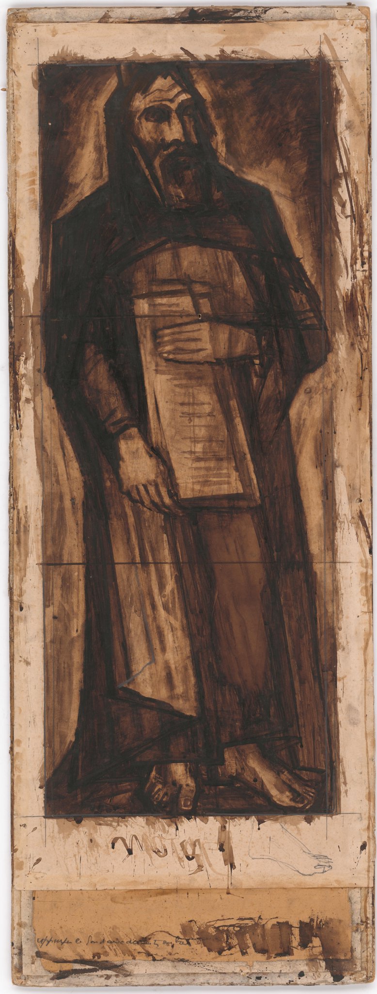 Ce travail préparatoire a été réalisé dans le cadre d'une commande de vitraux pour l'église Saint-Sigismond de Saint-Maurice en Valais. L'église ayant besoin d'être restaurée, le chanoine Louis Poncet propose à son frère de se charger de la réalisation de nouveaux vitraux, afin de remplacer les anciennes verrières du XIXème. La Paroisse disposant de peu de moyens, Marcel Poncet obtient un subside de la fondation Gleyre pour la réalisation de huit vitraux sur le thème des Prophètes. Les quatre premiers vitraux sont posés au cours de l'année 1944, et reçoivent des échos très positifs dans la presse. Les quatre derniers sont réalisés au cours de l'année 1946, et inaugurés en juin 1947. En 1960, les vitraux, alors jugés trop sombres pour la nef, ont été déplacés dans le choeur, superposés les uns au-dessus des autres. Ceux-ci n'ont retrouvé leur emplacement d'origine qu'en 2001, grâce à l'entremise de Jean-Pierre Coutaz, auteur des vitraux actuels du choeur. Ces oeuvres, qui jouent à la fois sur d'audacieux jeux de couleur et une grisaille abondante, semblent condenser les expériences antérieures de Marcel Poncet dans un nouvel équilibre entre ses métiers de peintre et de verrier. Les vitraux de Saint-Sigismond figurent, avec ceux de Saint-Paul de Grange-Canal et les quatre Evangélistes de la cathédrale de Lausanne, parmi ses réalisations les plus célèbres (NOVERRAZ, 2014, pp. 80-88 ; REYMOND, 1992, pp. 79, 108-112, 173-175 ; Dossier "Vitraux, Eglise Saint-Sigismond, Saint-Maurice, 1941-1947", boîte "VITRAUX II, 1932-1947", fonds Poncet, Vitrocentre Romont).