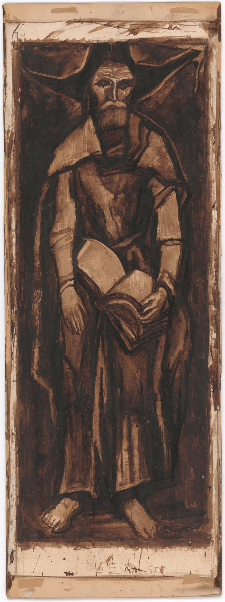 Ce travail préparatoire a été réalisé dans le cadre d'une commande de vitraux pour l'église Saint-Sigismond de Saint-Maurice en Valais. L'église ayant besoin d'être restaurée, le chanoine Louis Poncet propose à son frère de se charger de la réalisation de nouveaux vitraux, afin de remplacer les anciennes verrières du XIXème. La Paroisse disposant de peu de moyens, Marcel Poncet obtient un subside de la fondation Gleyre pour la réalisation de huit vitraux sur le thème des Prophètes. Les quatre premiers vitraux sont posés au cours de l'année 1944, et reçoivent des échos très positifs dans la presse. Les quatre derniers sont réalisés au cours de l'année 1946, et inaugurés en juin 1947. En 1960, les vitraux, alors jugés trop sombres pour la nef, ont été déplacés dans le choeur, superposés les uns au-dessus des autres. Ceux-ci n'ont retrouvé leur emplacement d'origine qu'en 2001, grâce à l'entremise de Jean-Pierre Coutaz, auteur des vitraux actuels du choeur. Ces oeuvres, qui jouent à la fois sur d'audacieux jeux de couleur et une grisaille abondante, semblent condenser les expériences antérieures de Marcel Poncet dans un nouvel équilibre entre ses métiers de peintre et de verrier. Les vitraux de Saint-Sigismond figurent, avec ceux de Saint-Paul de Grange-Canal et les quatre Evangélistes de la cathédrale de Lausanne, parmi ses réalisations les plus célèbres (NOVERRAZ, 2014, pp. 80-88 ; REYMOND, 1992, pp. 79, 108-112, 173-175 ; Dossier "Vitraux, Eglise Saint-Sigismond, Saint-Maurice, 1941-1947", boîte "VITRAUX II, 1932-1947", fonds Poncet, Vitrocentre Romont).