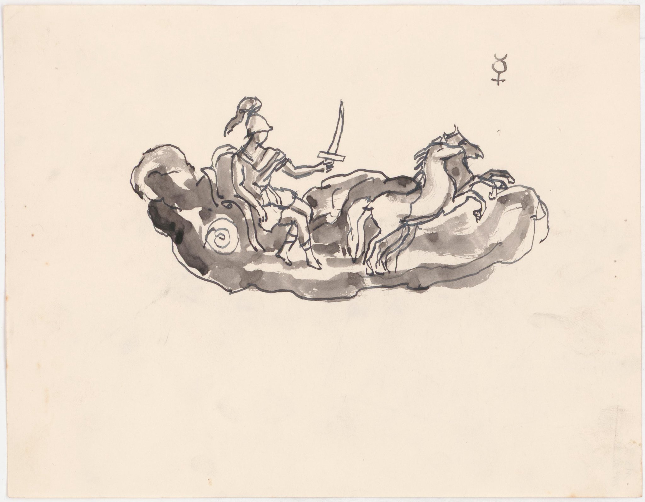 Esquisse pour des vitraux sur le thème de la "carte du ciel" : personnage armé d'une épée, sur un char tiré par deux chevaux. En haut à droite : symbole de la planète Mercure.