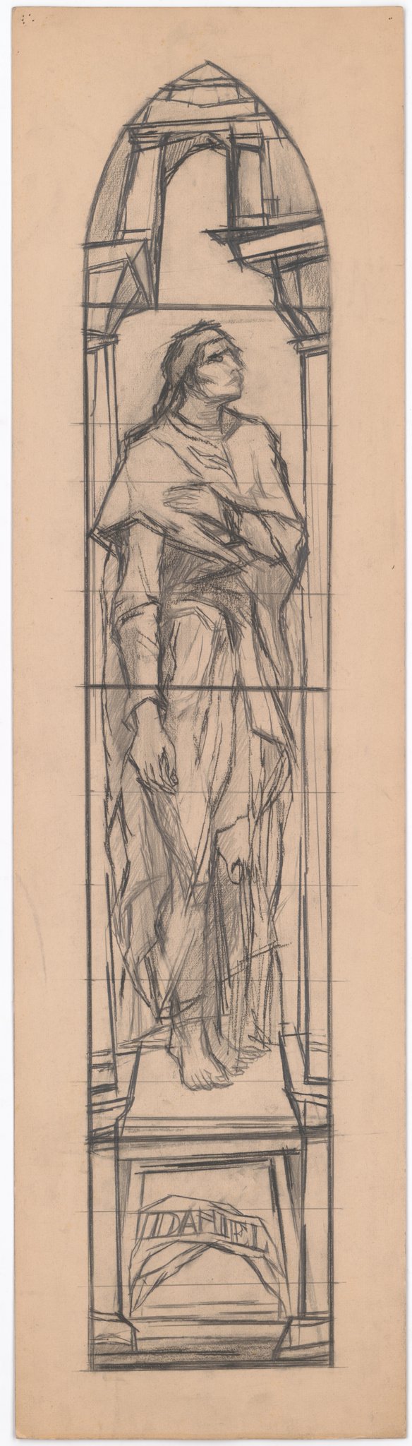 Daniel en pied, levant la tête vers le ciel, une main sur la poitrine. Il est encadré de colonnes soutenant une composition architecturale démesurée, et se tient sur un socle contenant un cartouche avec son nom.