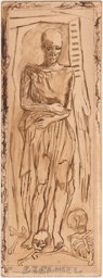 Le prophète Ezéchiel debout, le corps décharné, entouré de crânes jonchant le sol à ses pieds.