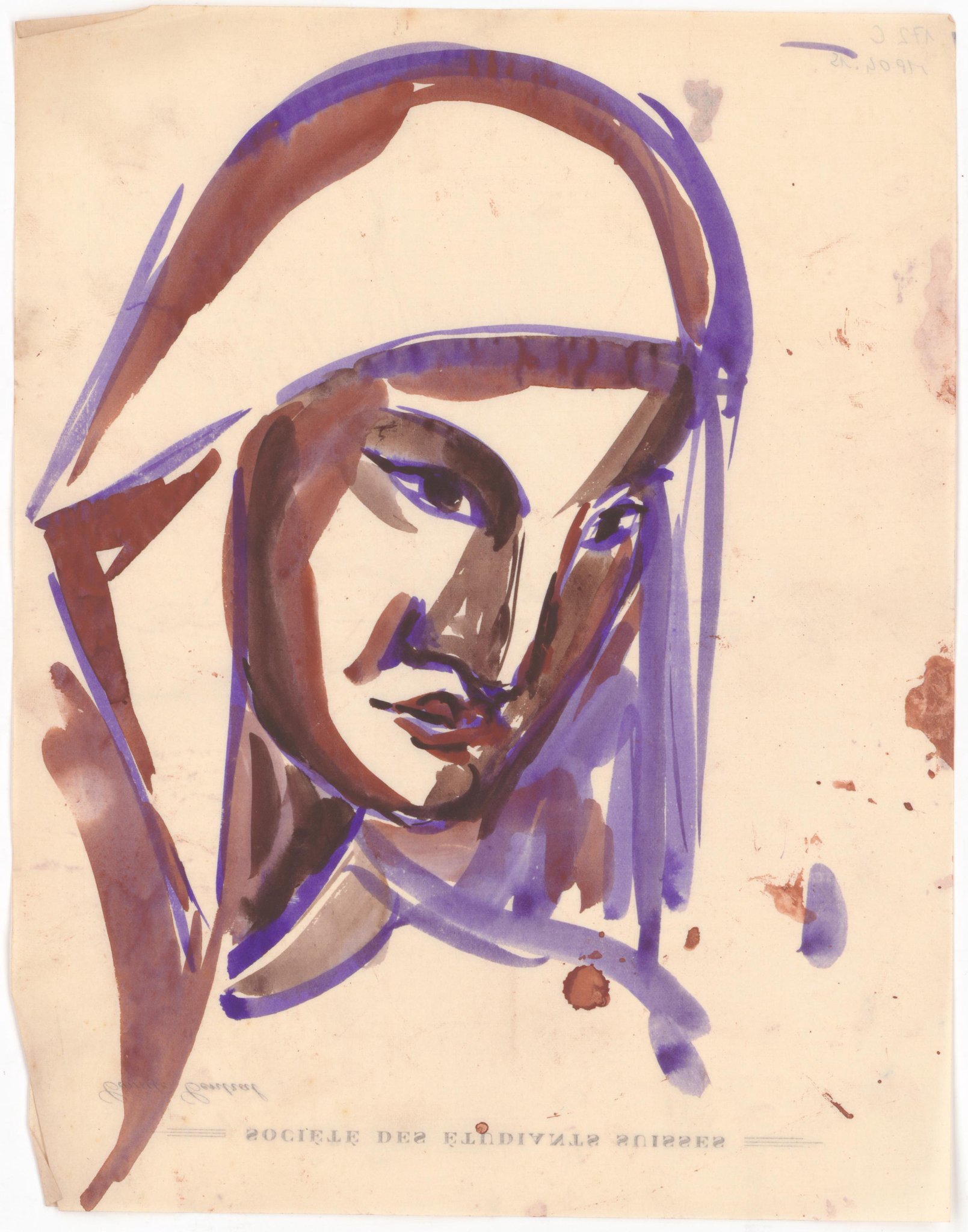 Buste de la Vierge, voilée et la tête légèrement penchée, de trois-quarts, les yeux ouverts.