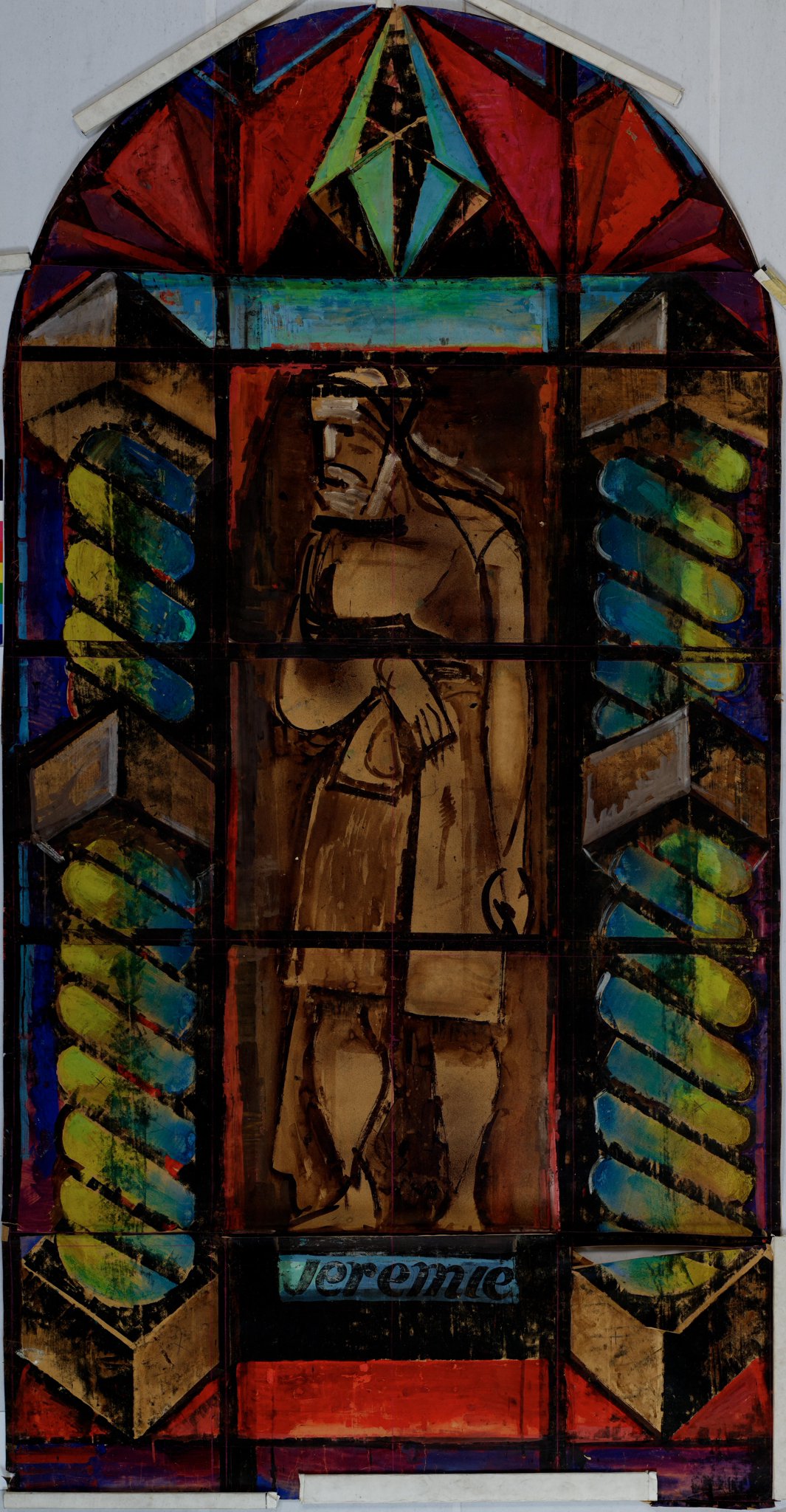 Ce travail préparatoire a été réalisé dans le cadre d'une commande de vitraux pour l'église Saint-Sigismond de Saint-Maurice en Valais. L'église ayant besoin d'être restaurée, le chanoine Louis Poncet propose à son frère de se charger de la réalisation de nouveaux vitraux, afin de remplacer les anciennes verrières du XIXème. La Paroisse disposant de peu de moyens, Marcel Poncet obtient un subside de la fondation Gleyre pour la réalisation de huit vitraux sur le thème des Prophètes. Les quatre premiers vitraux sont posés au cours de l'année 1944, et reçoivent des échos très positifs dans la presse. Les quatre derniers sont réalisés au cours de l'année 1946, et inaugurés en juin 1947. En 1960, les vitraux, alors jugés trop sombres pour la nef, ont été déplacés dans le choeur, superposés les uns au-dessus des autres. Ceux-ci n'ont retrouvé leur emplacement d'origine qu'en 2001, grâce à l'entremise de Jean-Pierre Coutaz, auteur des vitraux actuels du choeur. Ces oeuvres, qui jouent à la fois sur d'audacieux jeux de couleur et une grisaille abondante, semblent condenser les expériences antérieures de Marcel Poncet dans un nouvel équilibre entre ses métiers de peintre et de verrier. Les vitraux de Saint-Sigismond figurent, avec ceux de Saint-Paul de Grange-Canal et les quatre Evangélistes de la cathédrale de Lausanne, parmi ses réalisations les plus célèbres (NOVERRAZ, 2014, pp. 80-88 ; REYMOND, 1992, pp. 79, 108-112, 173-175 ; Dossier "Vitraux, Eglise Saint-Sigismond, Saint-Maurice, 1941-1947", boîte "VITRAUX II, 1932-1947", fonds Poncet, Vitrocentre Romont).
