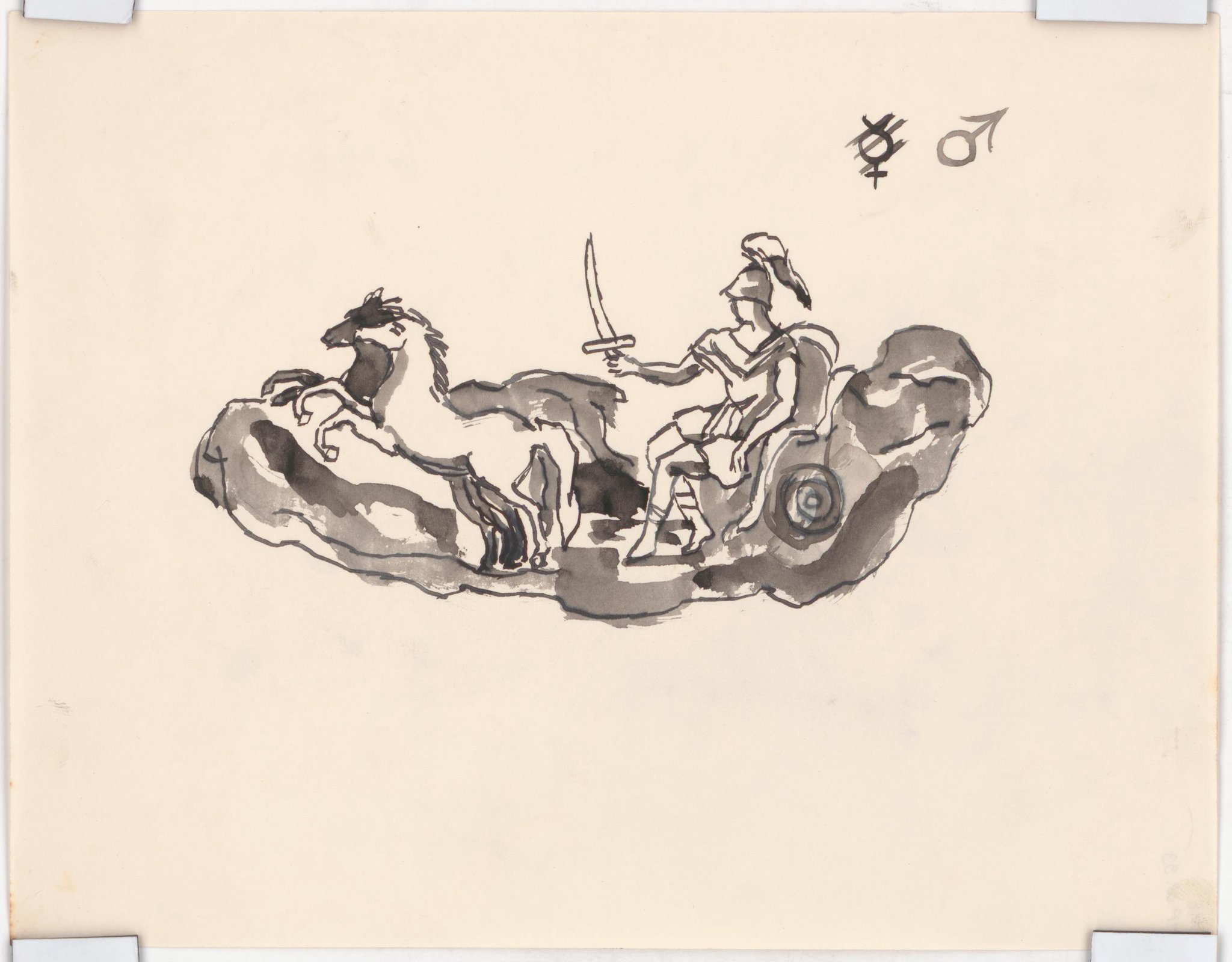 Esquisse pour des vitraux sur le thème de la "carte du ciel": le Dieu Mars, tenant une épée, assis sur un char tiré par deux chevaux. En haut à droite : symbole de la planète mars.