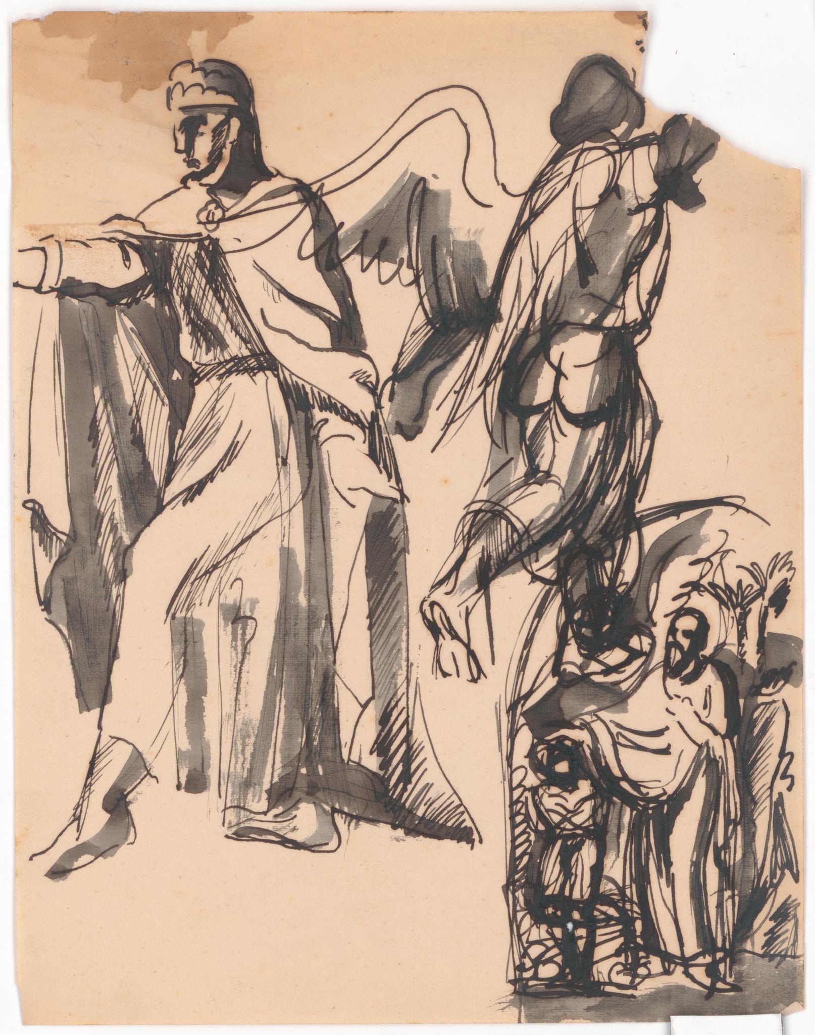 A gauche, personnage debout vêtu d'une longue cape et levant un bras (Abraham ?). A droite, l'ange de dos venant interrompre le sacrifice. En bas à droite, composition en forme de baie avec Abraham tenant Isaac agenouillé sur l'autel, et regardant l'ange qui apparaît à sa droite.