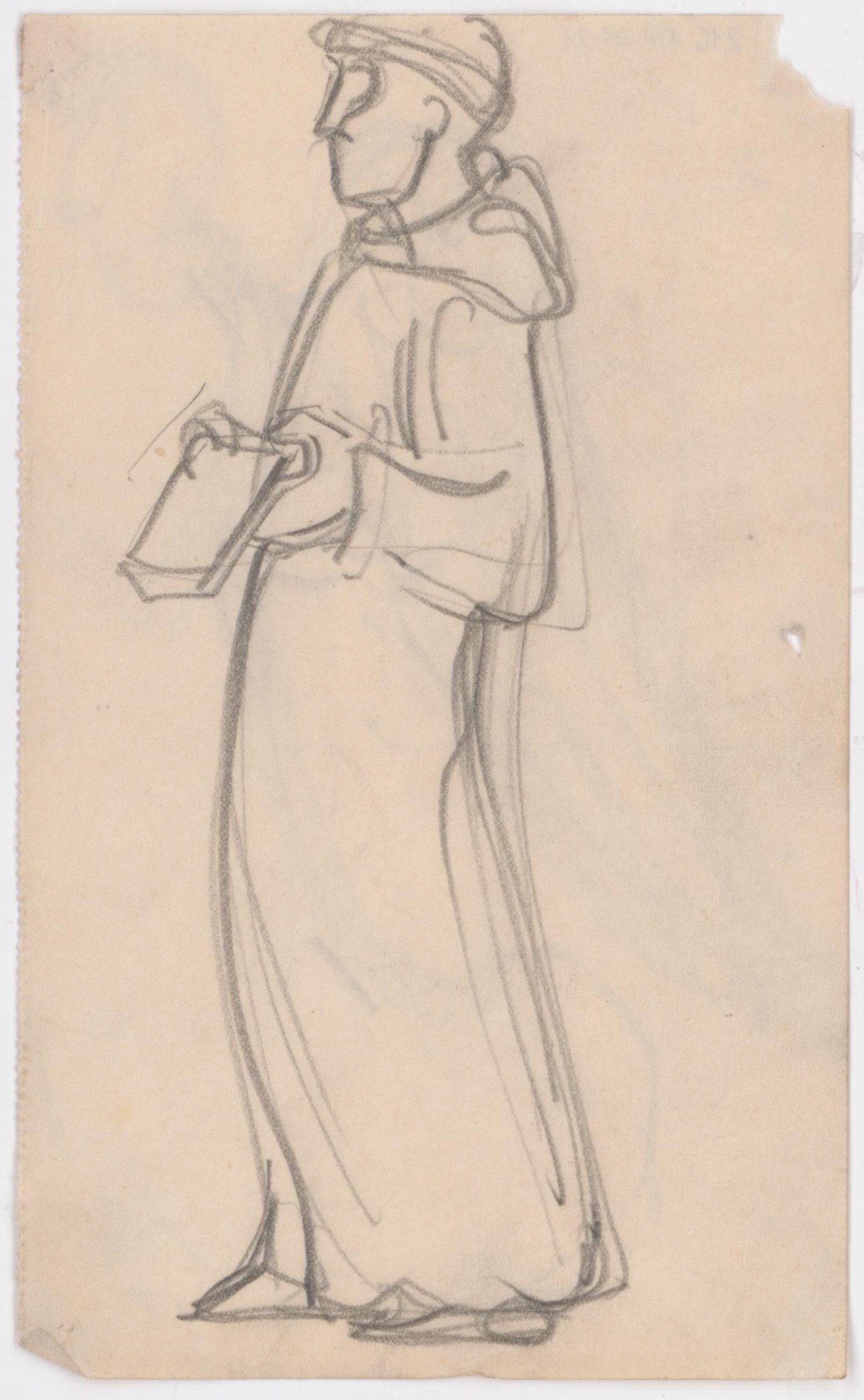 Plus de 70 projets peuvent être rattachés aux vitraux de Saint-Paul, et 51 aux trois vitraux des bas-côtés, mais l’ensemble n’est probablement pas complet. Pour le vitrail de saint François, il existe 12 oeuvres graphiques, dont sept peuvent être reliées à la scène médiane du vitrail (MP_01.20 ; MP_01.22 ; MP_01.21 ; MP_01.25 ; MP_01.26 ; MP_01.27 ; MP_01.75). Sur cette esquisse, l'artiste dessine le saint de profil, tenant un livre devant lui. On peut la relier à une première version de la scène de saint François prêchant aux oiseaux, dans laquelle le saint est représenté debout à droite devant un étang sur lequel flotte deux cygnes (MP_01.75). Peut-être à la demande du commanditaire, l'abbé Jacquet, l'artiste abandonnera cette version pour opter dans ses projets suivants (MP_01.25 ; MP_01.26 ; MP_01.27) pour une construction plus symétrique, où le saint occupe une place centrale, importante pour l'équilibre visuel de l'ensemble du vitrail. Une autre esquisse similaire de saint François de profil peut également être mise en lien avec ce projet avec des cygnes (MP_01.20).
