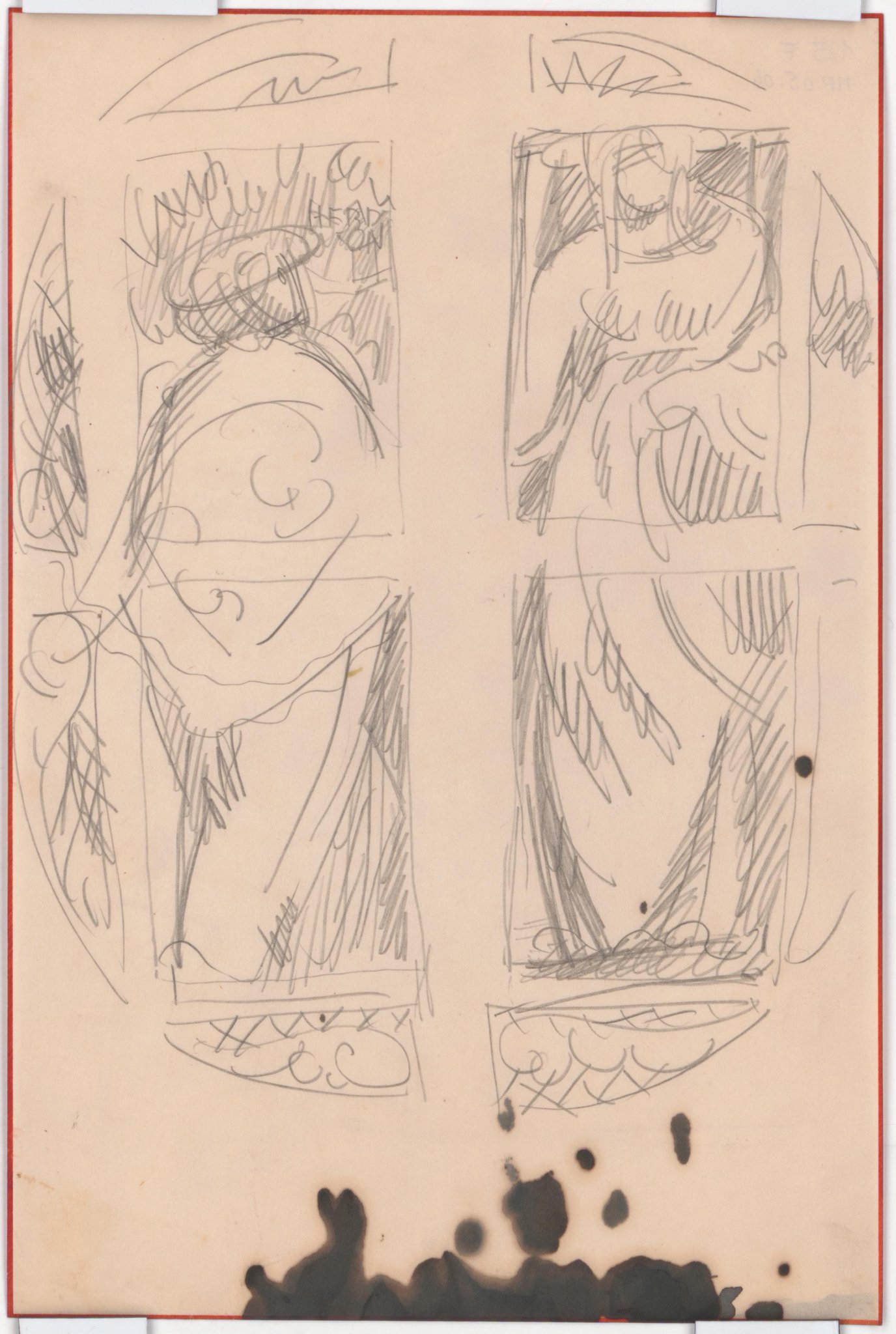 Esquisse pour le vitrail de la Visitation : de forme ronde, dont le centre est découpé en quatre parties, comprenant Élisabeth à gauche de dos, accueillant Marie debout sur la droite.