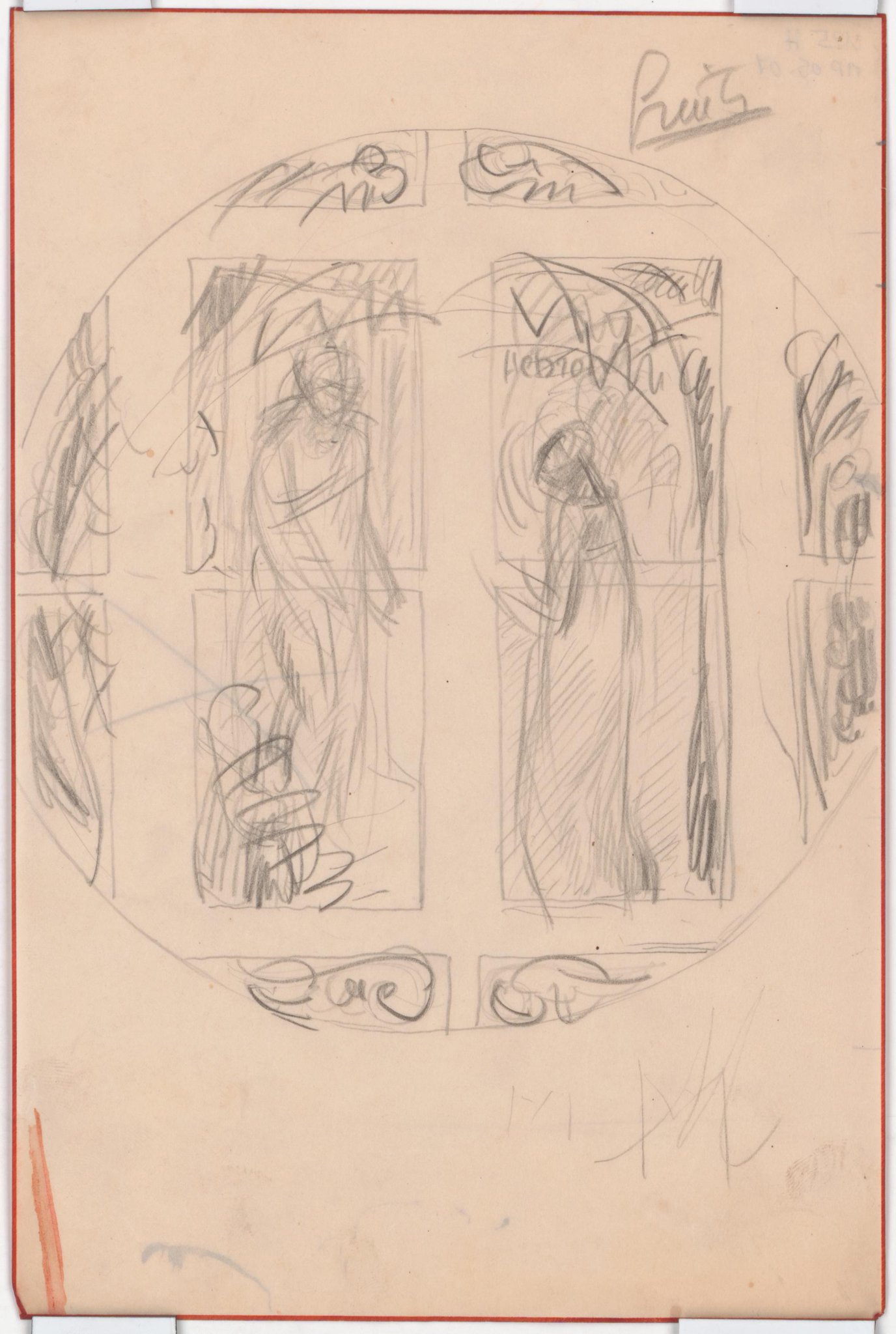 Esquisse pour le vitrail de la Visitation : de forme ronde, dont le centre est découpé en quatre parties, comprenant Élisabeth à gauche de dos, accueillant Marie debout sur la droite.