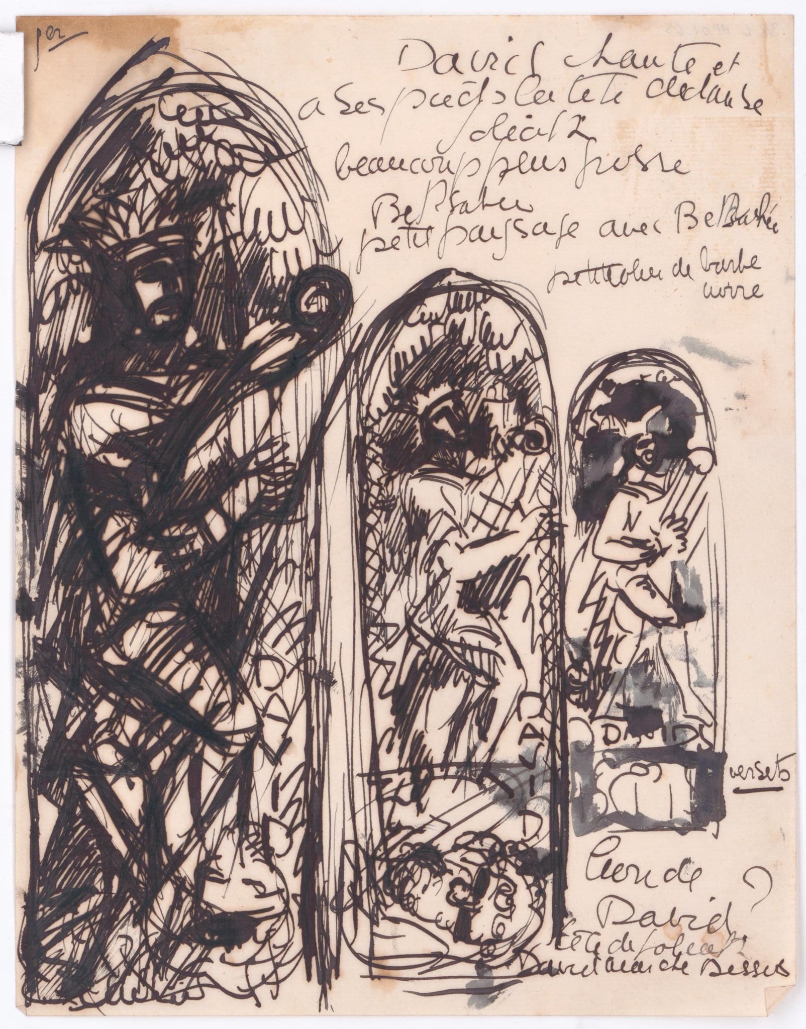 Plus de 70 œuvres graphiques peuvent être rattachées aux vitraux de Saint-Paul, et 21 aux vitraux de la tribune. Pour le vitrail de David, il en existe cinq (MP_01.65 ; MP_01.66 ; MP_01.67 ; MP_01.68 ; MP_01.71). Ce dessin présente trois croquis de la figure de David, accompagnés de notes posées de manière libre sans réelle continuité, témoignant de la réflexion de l'artiste pour établir les caractéristiques de son personnage. Comme leur lecture le révèle, il se demande s'il ne devrait pas placer la figure de Goliath aux pieds du roi, ou intégrer le lion de David. Les croquis montrent une représentation plus animée de son personnage en train de jouer de la harpe, une jambe levée et le corps en mouvement, que l'on retrouve sur une deuxième esquisse (MP_01.66). Elle évolue ensuite vers une version définitive où le saint est plus frontal, correspondant à une troisième esquisse (MP_01.67), qui sera reprise sur la maquette (MP_01.68) et le carton (MP_01.71).