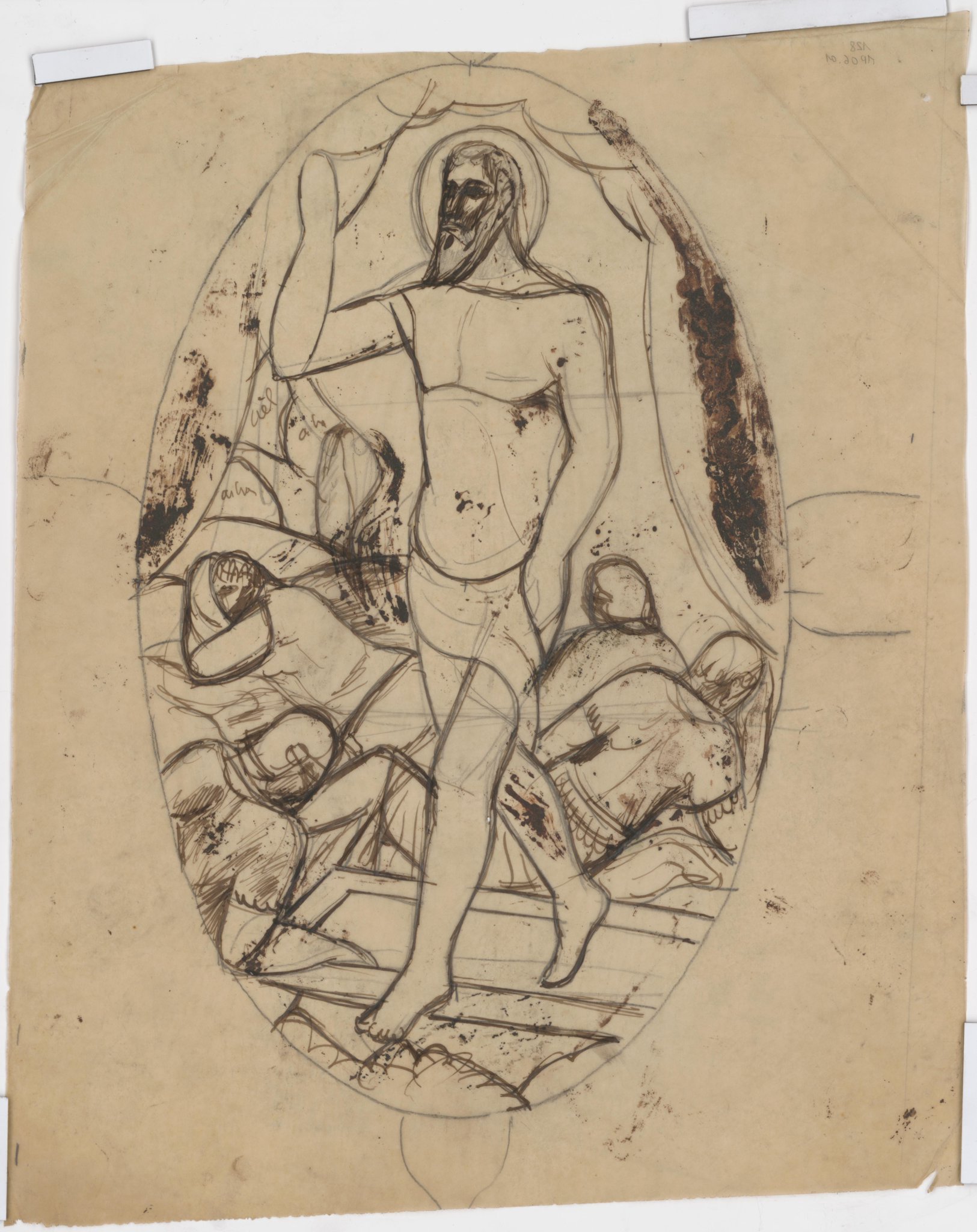 Il s'agit d'un travail préparatoire pour le médaillon situé en bas à droite de la lancette de droite de la verrière. Celle-ci est composée de trois médaillons par lancette, ceux concernant la vie de la Vierge à gauche, et à droite la vie du Christ : l'arrestation de Jésus, le portement de croix et la résurrection. Il s'agit du seul travail préparatoire conservé pour ce cycle détaillant l'un des médaillons.