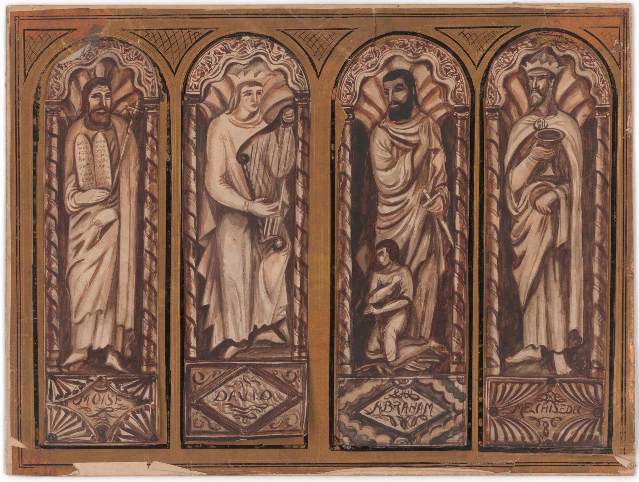 L'analyse du fonds graphique indique que l'artiste a commencé par réfléchir aux caractéristiques physiques et psychologiques des personnages à représenter, comme le démontrent certaines esquisse accompagnées de notes (MP_01.53 ; MP_01.62), l'une d'elle citant également des sources visuelles, à l'instar des ballets russes et Don Quichotte (MP_01.50). Il travaille ensuite ses personnages dans le contexte du vitrail, s'intéressant à la composition générale et à la proportion du prophète par rapport à l'encadrement architectural, ainsi qu'au style de celui-ci (par exemple MP_01.64 ; MP_01.59 ; MP_01.58). Une fois son dessin fixé, il réalise cette maquette assez aboutie, traitée en camaïeu. Elle présente quelques différences avec les verrières, notamment en ce qui concerne les soubassements avec les inscriptions, ou certains détails comme la position de la main gauche de Melchisedech, qui tient le calice, ou celle de Moïse qui lève le doigt vers le ciel. Il établit ensuite des cartons en couleur, notamment pour Melchisedech et pour David (MP_01.71 ; MP_01.73).