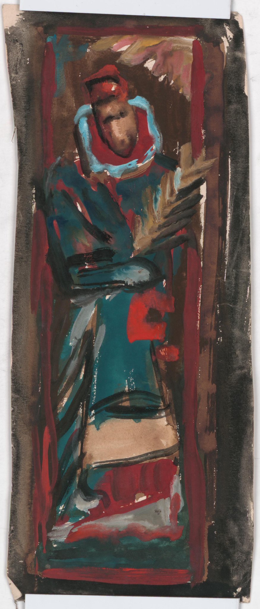 Poncet conçoit une première série de projets très colorés, dont font partie ces petites esquisses, qu'il délaisse subitement dans un second temps pour se tourner vers des figures de saints torturés et pathétiques qu'il réalise à la sépia, se rapprochant beaucoup plus du résultat des vitraux. On ignore cependant pourquoi Poncet modifie d'une manière aussi radicale son projet, d'autant qu'il ne semble pas en avoir averti les commanditaires, très choqués au moment de leur pose.