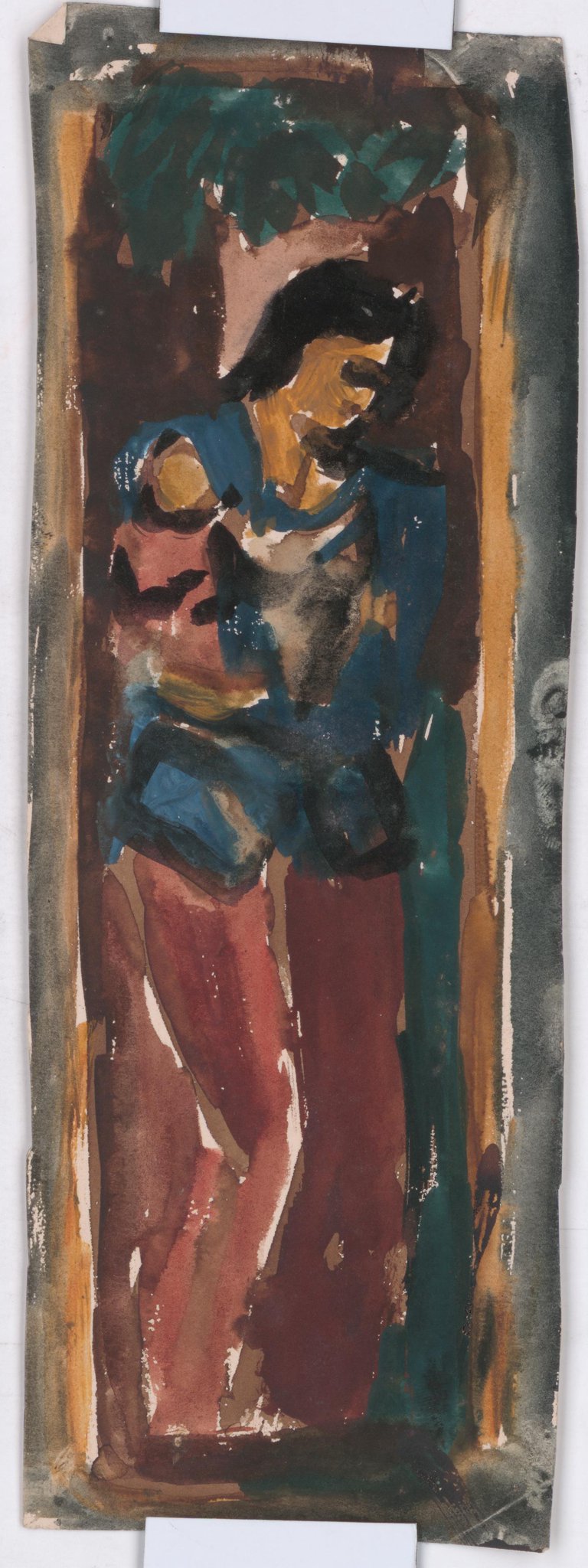 Poncet conçoit une première série de projets très colorés, dont font partie ces petites esquisses, qu'il délaisse subitement dans un second temps pour se tourner vers des figures de saints torturés et pathétiques qu'il réalise à la sépia, se rapprochant beaucoup plus du résultat des vitraux. On ignore cependant pourquoi Poncet modifie d'une manière aussi radicale son projet, d'autant qu'il ne semble pas en avoir averti les commanditaires, très choqués au moment de leur pose.