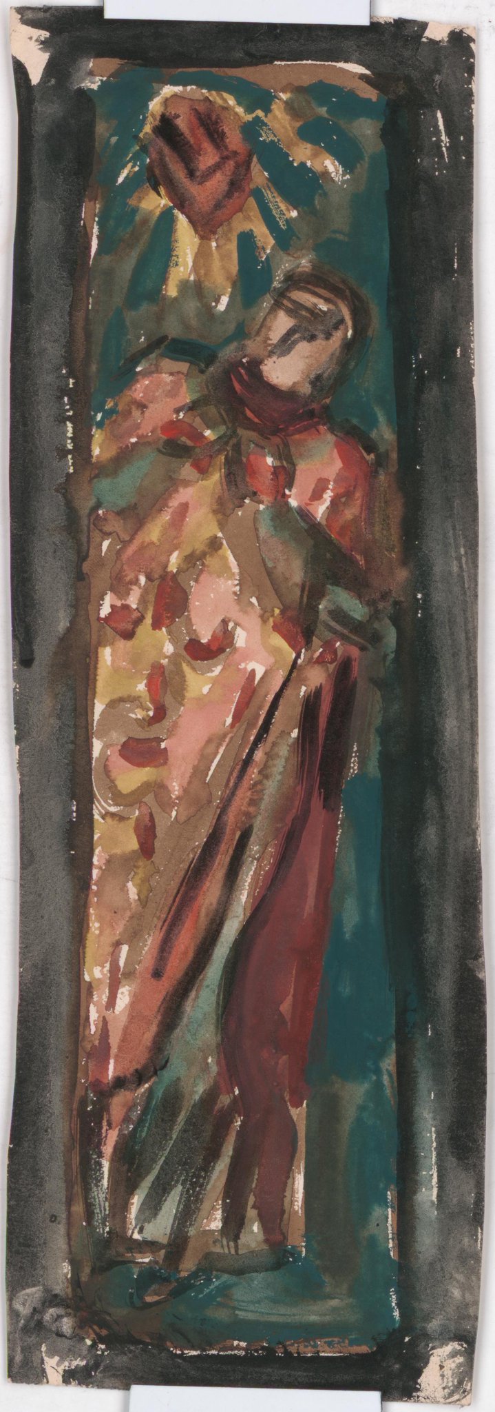 Poncet conçoit une première série de projets très colorés, dont font partie ces petites esquisses, qu'il délaisse subitement dans un second temps pour se tourner vers des figures de saints torturés et pathétiques qu'il réalise à la sépia, se rapprochant beaucoup plus du résultat des vitraux. On ignore cependant pourquoi Poncet modifie d'une manière aussi radicale son projet, d'autant qu'il ne semble pas en avoir averti les commanditaires, très choqués au moment de leur pose.