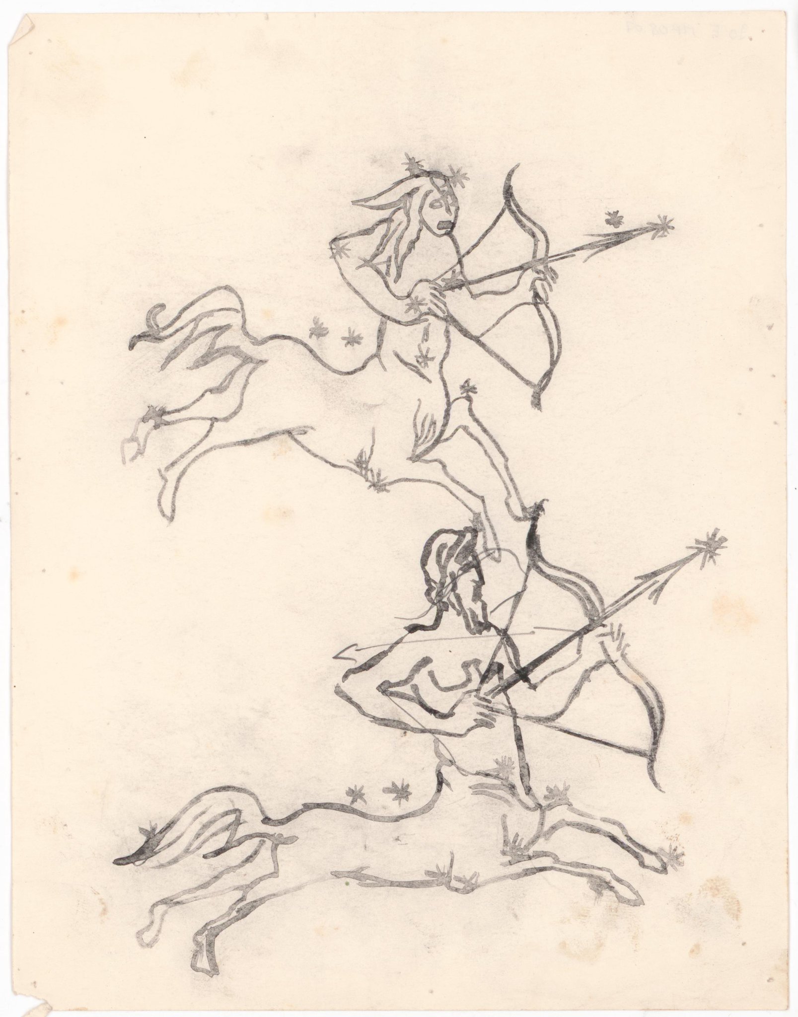 Esquisse pour des vitraux sur le thème de la "carte du ciel": deux esquisses du signe du Sagittaire, constellé d'étoiles et tirant à l'arc, celui du haut aux cheveux longs, celui du bas barbu.
