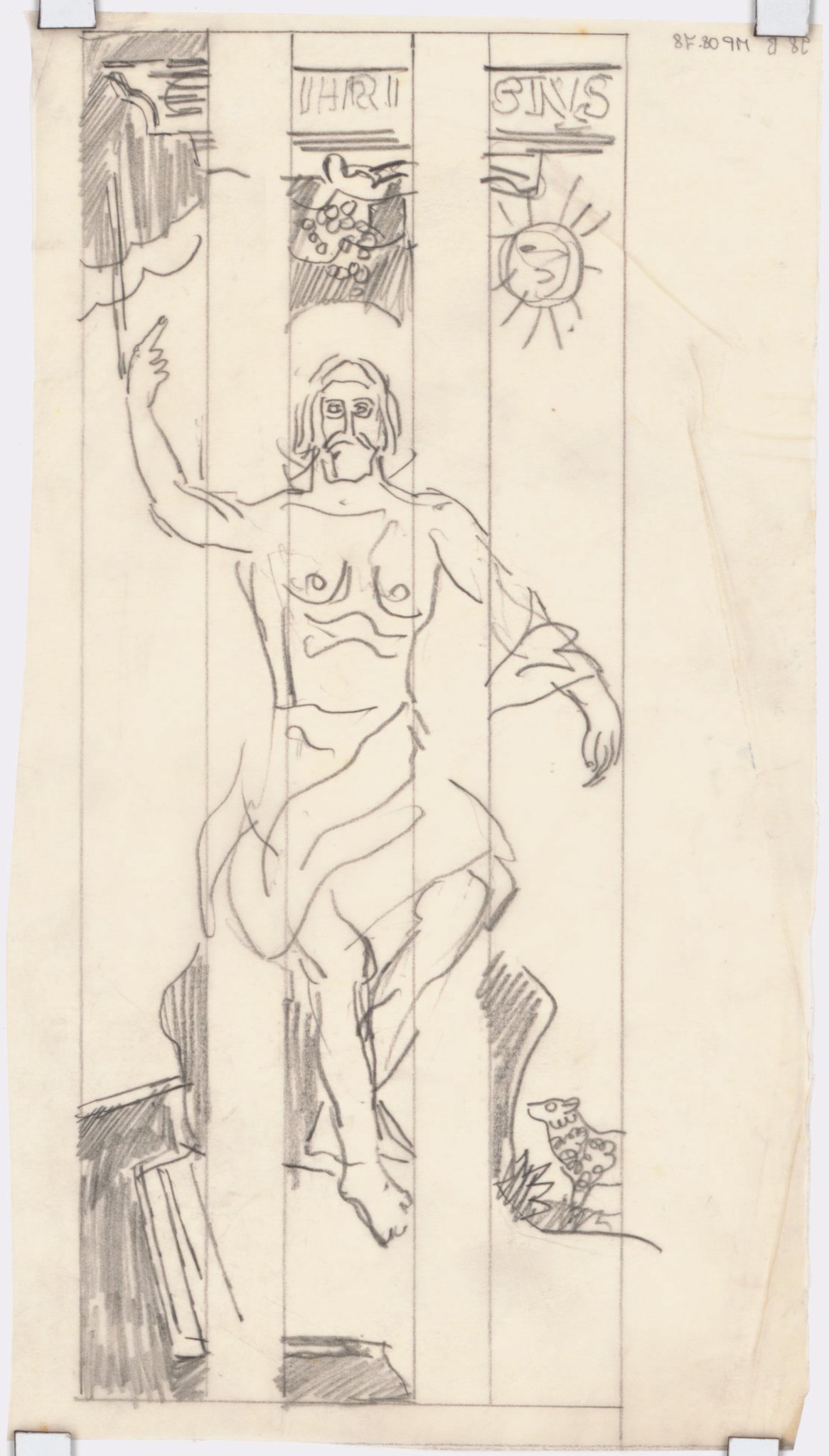 Esquisse pour des vitraux sur le thème de la "carte du ciel" : le Christ du centre de la carte du ciel, auréolé et levant le bras droite pour pointer le ciel, assis sur un rocher accompagné d'un petit mouton à droite. Au-dessus de lui, dans le ciel nuageux, sont représentés une grappe de raisin au centre et un soleil à droite.